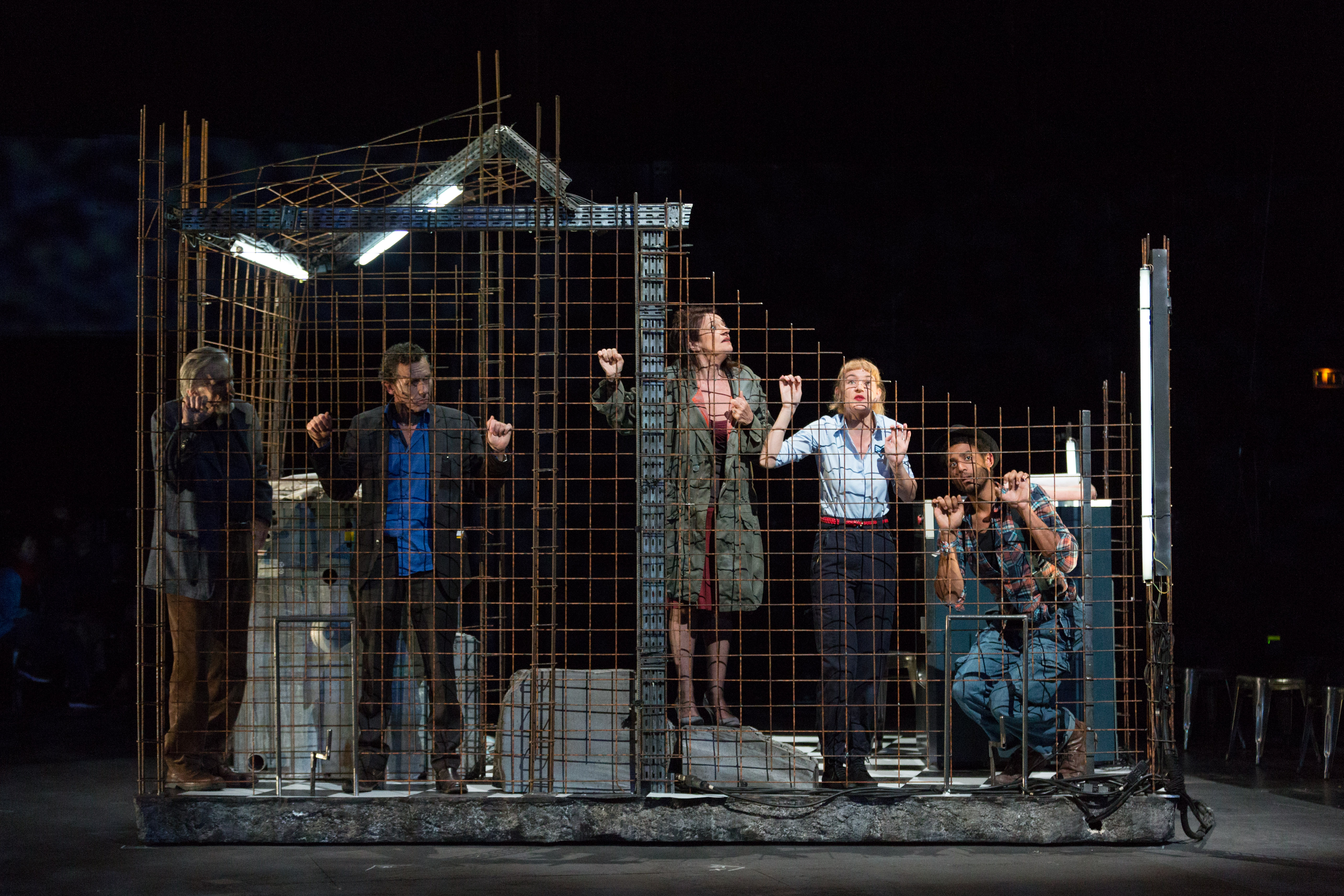 Après un résumé visuel de la première partie sur un support en lanières en plastique en avant scène (un peu comme les rideaux qui coupent du froid dans les entrepôts) des derniers épisodes. Hugo, le directeur du cabinet (Matthias Girbig, qu’est ce qu’il est bien cet acteur !) arrive de la salle, toujours aussi désorienté et dépassé. Puis nous revoilà sous terre, au centre du drame. Hic ! C’est le vieux qui est mort et bientôt ça ne sentira pas la rose… Pas de chœur citoyen dans ces épisodes. Les enfermés endossent cette fois deux rôles : Nabil (le futur grand vidéaste) est aussi un collègue d’Hugo, la jeune flic quant à elle, est aussi une militante qui va sans doute avoir une petite histoire d’amour avec le directeur du cabinet, la toubib (Christine Gagnieux, très très bien) se transforme en serveuse du bar où vient se ressourcer Hugo …