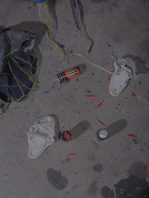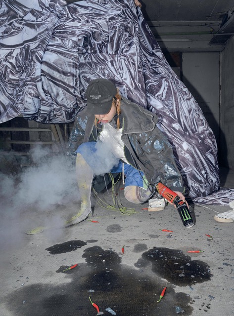 A même le sol, un cluster de canettes métalliques, Monster multicolores, jaune, rose, vert, rouge… : fluo. Boissons énergisantes. Sur le sol de béton, des câbles électriques épars tracent d’improbables arabesques, plus loin une toile entortillée, sombre comme un lac. Lui : de dos, lenteur extrême, disparaissant sous des couches de vêtements. Comme défroqué. Collant blanc crasseux, fripé, veste anorak d’où pendent matières effilochées vertes et autres fils électriques. Tout n’est qu’appendice. Le studio 8 du CND apparait spacieux entre ses quatre murs de béton, produit une sensation de dépeuplement, un vide inquiétant, comme si tout ce qui restait de l’humanité avait été aspiré dans cette créature vagabonde. Cutting Mushrooms opère une dépressurisation et une dépression, obère nos capacités à nommer. Quand bien même je ne pourrais m’empêcher de projeter ce que je crois reconnaître sur ce que je vois : un SDF, une figure marginale, de celles qui peuplent le bord éloigné de nos regards, quelque chose me retient. La performance de Kidows Kim déterritorialise le reconnaissable vers l’inconnu. Ce qui est visible est oblitéré par ce que l’on entend sans comprendre. La pensée est mise à l’arrêt, engluée, hypnotisée par une symphonie de sons étranges s’approchant d’une respiration chargée, de mouvements liquides, mais on peut aussi y entendre la fonte des glaciers, le débordement d’un volcan, des sonorités amples et souterraines, des bruits lointains et intimes comme un gargouillement. L’espace est un ventre. La figure produite par Kidows Kim avance comme entravée. Elle est un délitement. Intubée, un tuyau noir est enfoncé dans sa bouche, comme une ligne de vie.