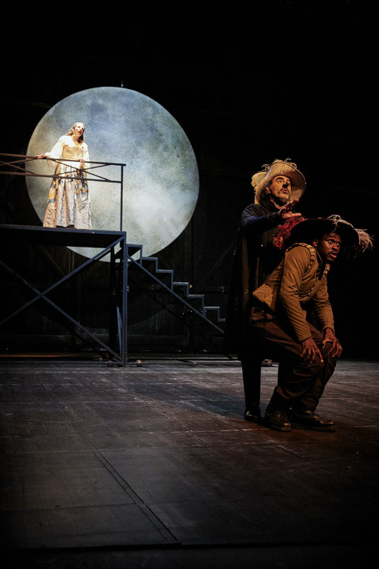 Ce qui importe également pour les deux metteurs en scène est la vérité des sentiments gravés avec génie par ces drôles d’alexandrins, inscrivant l’héroïsme dans la trivialité, dans ce jeu de dupe, ce quiproquo tragique. Avec cette pièce il y a quelque chose d’imparable qui étrangement résiste à tout, c’est ce maelstrom d’émotions, loin d’être ridicule, qui monte sans coup férir, vous bouscule sévère et auquel quoiqu’on s’en défende on ne résiste pas. Bonheur pour les comédiens qui s’emparent de leur rôle, dirigés au cordeau, avec une énergie sans faille, sans jamais tomber dans le cliché rebattu. Roxane est loin d’être le petit tanagra fragile et délicat, précieuse un peu bêcheuse. Laurie Barthélemy avec conviction lui donne un sacré caractère, jeune fille résolue, têtue et volontaire. Elle a la fougue et l’impudence amoureuse qui fait se rompre toutes les digues des conventions et de la bienséance. Christian (Olivier Dote Doevi) ne la joue pas jeune premier, beau gosse et tout le toutim. Il est désarmant, fragile et désarmé devant des sentiments contradictoires et une mascarade qui très vite le dépasse et le pousse au sacrifice. Et Cyrano ? Rodolphe Dana s’en tire avec les honneurs. Il s’empare haut la main de ce rôle vertigineux et monstre avec un talent certain et bravache qui sied au personnage. Des scènes cultes (la tirade des nez, la scène du balcon, sa mort…) il fait de chacune d’elle un heureux sort, d’une sincérité qui vous poigne, lui offrant relief, pleins et déliés, jouant même de sa fatigue. Et il peut compter sur un public acquis tout à sa cause allant jusque lui souffler sans qu’il en soit nécessaire les répliques (ça, en hommage à la spectatrice qui, derrière moi, ne manquait pas de finir chaque vers.)