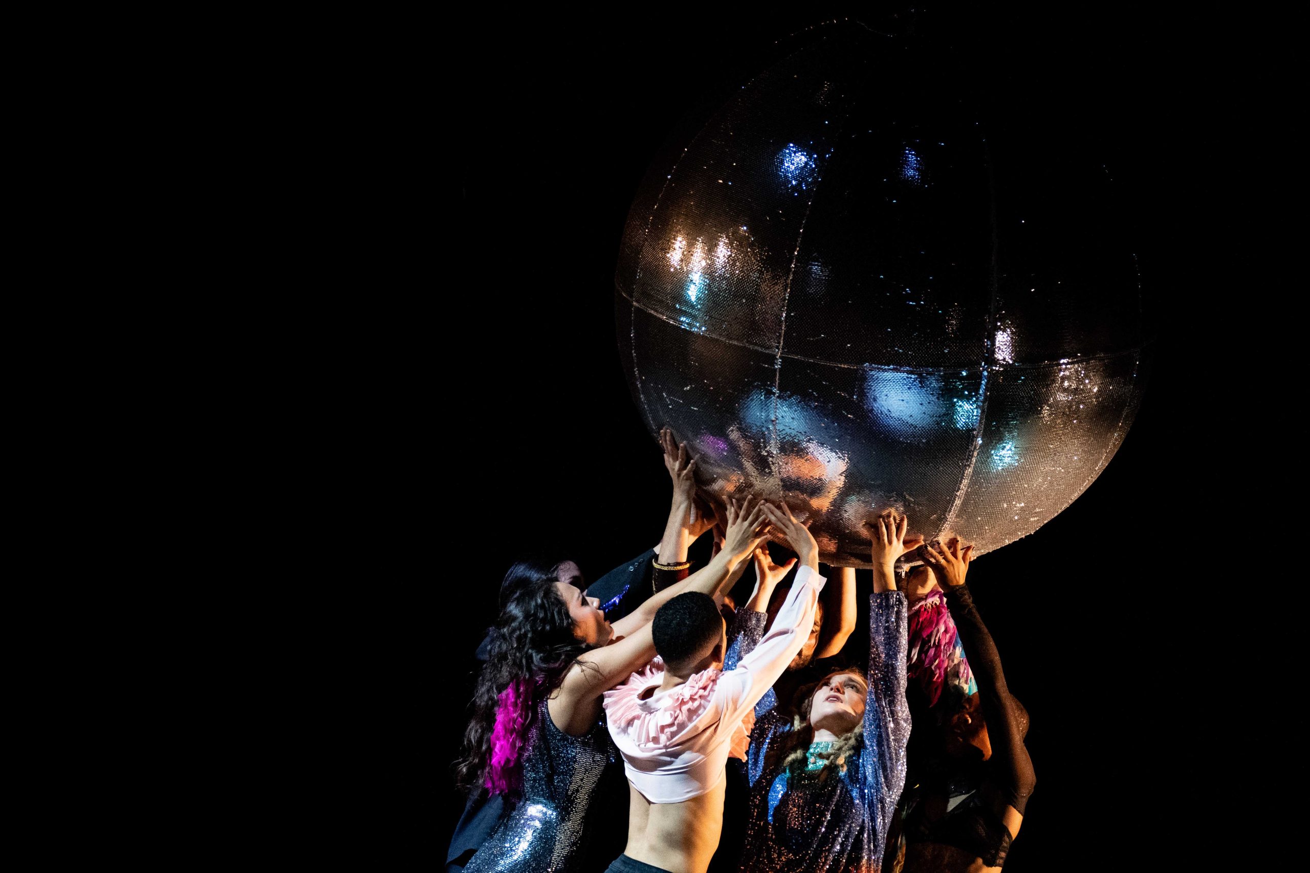 D.I.S.C.O. s’inscrit, comme son nom l’informe, dans une période. Dans un style musical qui marqua de son acmé les dancefloors. Développe sa chorégraphie elle-même inspirée du Waacking, style apparu en parallèle du Voguing et pareillement porté jusqu’à l’ultime sophistication par les afro-américains homosexuels. C’est dire si la pièce de Josépha Madoki est ultra référencée. Autour d’une DJ, blonde aux platines (et blonde platine), gravite progressivement toute une faune haute en couleurs. Chacun se montre sous ses plus beaux atours, boa, lamé,… et surtout chacun tel un paon fait sa roue : les solos introductifs, virtuoses, sont l’occasion d’entrer en scène et de faire sa scène. Sur le parcours de la pièce, la DJ, initialement située en bord latéral de scène se retrouvera à occuper une position centrale, manière de pointer l’évolution qui a conduit jusqu’à la starification actuelle des grands prêtres de la nuit.