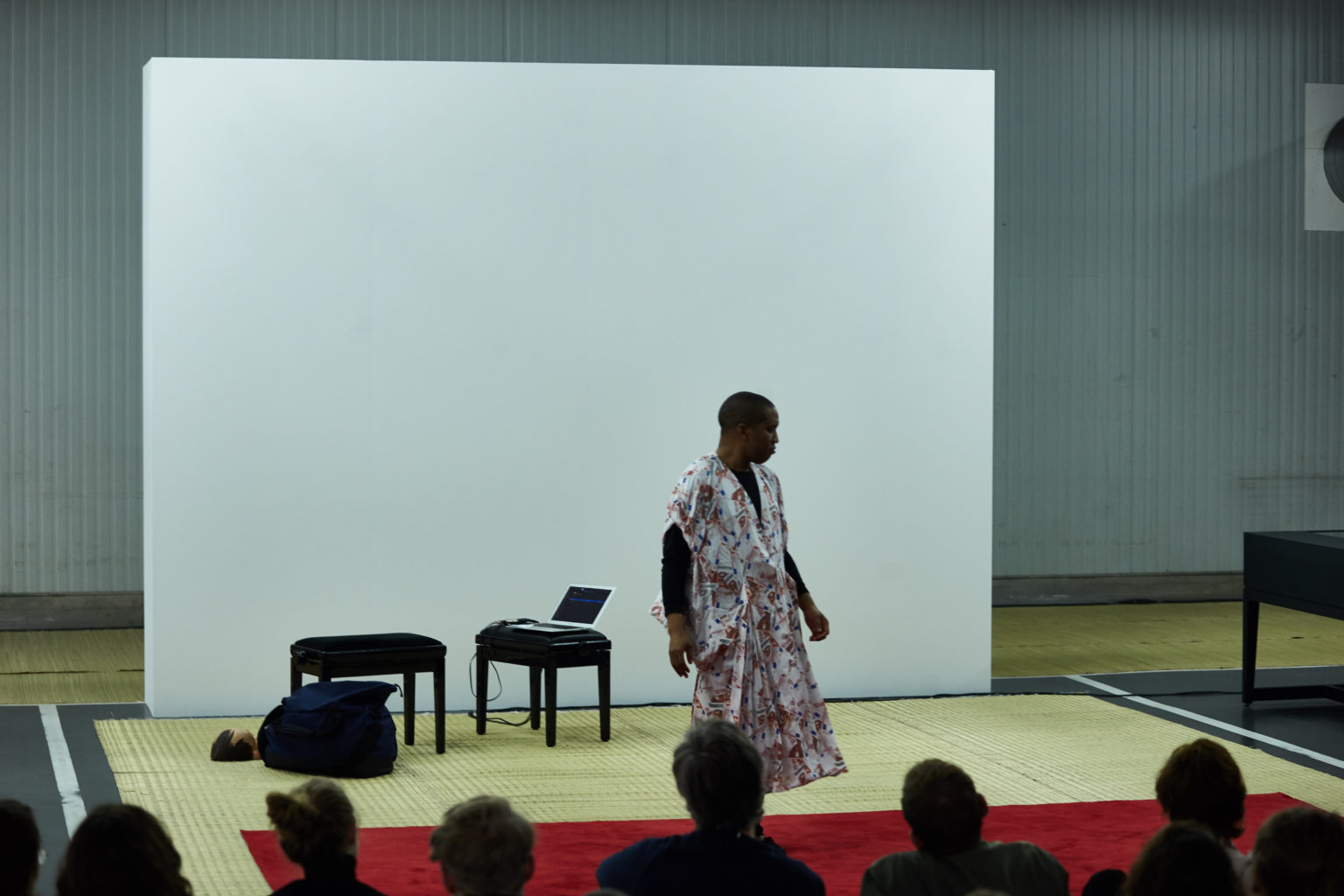 Dans la petite salle de La Commune, il y a juste un rectangle blanc formé de tapis de danse, et sur ce rectangle, un tapis de paille, et sur ce tapis de paille, un tapis rouge. Un podium au ras du sol : red carpet. Lorsqu’il paraîtra, Trajal Harrell sera vêtu d’un pantalon de jogging noir orné des fameuses trois bandes blanches, et d’un tee-shirt à manches longues également noir. Sans oublier un masque en plastique façon cartoon, qui lui donnerait l’air, avec le sac de sport en bandoulière, d’un cambrioleur. Effraction donc, comme une fausse piste, puis le masque très vite déposé. Bas les masques donc !