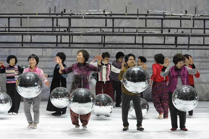 Toujours la même exubérance, toujours cette incroyable énergie et pourtant il se mêle à tout ça une profonde émotion, une gravité légère. Dancing Grand Mothers, portrait d’une génération silencieuse, ces femmes aujourd’hui âgées, ces ajoumas – soit épouses et mères ayant de fait renoncé à toutes séductions – qui dans la danse retrouvent une liberté effacée par leur rôle attribué au sein de la société coréenne. Eun-Me Ahn balaye effrontément, audacieusement, les règles sociales établies pour imposer sur le plateau un joyeux débordement. Ce qui s’exprime sur le plateau c’est un corps défait, usé par le travail et le temps, certes, mais surtout et avant tout la mémoire de ces corps, contenants de gestes simples, quotidiens qui deviennent des matrices de danses incroyables. Elles sont bouleversantes ces femmes âgées dansantes, frêles, timides et audacieuses qui sur le plateau affirment soudain leur identité profonde et avancent enfin à découvert, à petit pas, crânement. Filmées dans la rue, dans les champs, sur leur lieu de travail, encore une fois sans musique, juste pour découvrir combien ces corps s’expriment avec une énergie qui dément leur âge, s’affranchissent des regards avec une déroutante pudeur qui en dévoile bien plus. Et sur le plateau, joliment endimanchées comme pour un premier bal, maladroites et gauches et pourtant d’une grâce étrange et stupéfiante, elles expriment ce que la danse a de plus profond et d’archaïque, l’expression d’une mémoire collective enfouie. On se dit alors qu’avec ces femmes la danse, c’est bien plus que de la danse. Il y a une authenticité déroutante, balayant toute technicité, une humanité joyeuse qui vous renverse. Eun-Me Ahn joue avec bonheur et habilement des contrastes entre l’énergie trépidante des jeunes de sa compagnie qui reprennent les gestes de ces femmes, gestes qui s’affolent bientôt jusqu’à la transe, et la fragilité malhabile et heureuse des ajoumas. De cet arc tendu, vibrant, entre deux générations qui s’épaulent, s’accompagnent sur le plateau, la danse, le mouvement semble être en continu, affranchi de toute temporalité, contenu pourtant en quelques fractions de temps, celui d’une chanson. Et l’on est soudain ému de quelques frêles pas ébauchés sur une scie, « tombe la neige » (en coréen), parce que dans ces quelques pas c’est toute une génération qui transmet le poids d’une vie, l’histoire d’un pays. Avec Eun-Me Ahn la danse est affaire de mouvement, quoi de plus normal, mais un mouvement dynamique qui contiendrait dans ses moindres gestes et variations, aussi ténus soient-ils, et malgré les mutations profondes inévitables d’une société, l’ADN d’une civilisation.