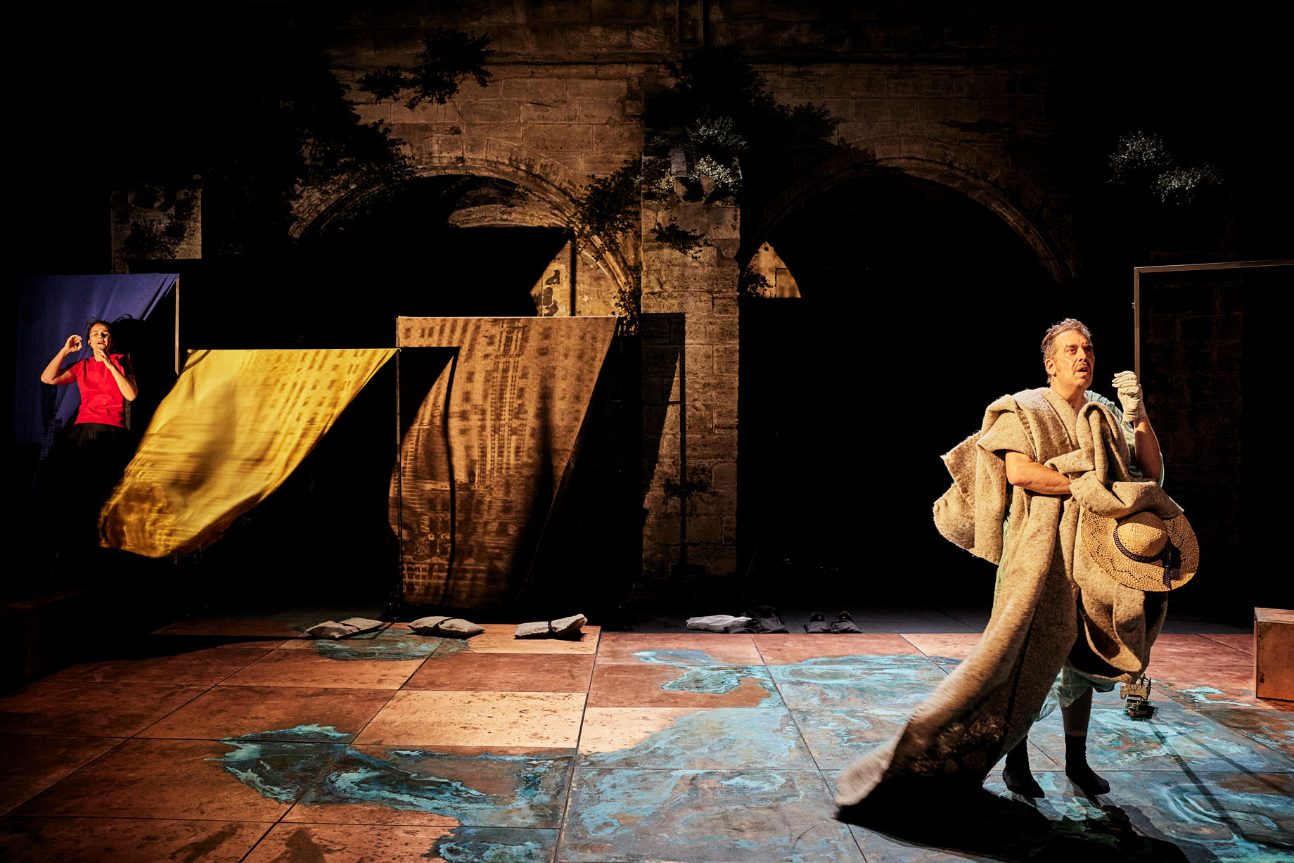 Marie Vialle porte la puissance de cette histoire, qu’elle s’est appropriée aussi bien comme metteuse en scène que comédienne, avec une sensibilité extrême, dans un dépouillement scénographique approprié. Dans le décor naturel de ce Cloître magique des Célestins où la végétalisation s’impose naturellement dans les interstices de ses pierres et piliers multi-centenaires et la puissance de ses deux platanes légendaires, tout ajout pouvait sembler superflu : un sol minéral, des tissus pastel comme des voiles, telles les branches souples de certains arbres ou roseaux qui plient mais ne rompent pas, jeux des caprices de la nature, et notamment du mistral qui soufflait par moments avec rage et à propos sur le plateau. Quel don du ciel quand le Dionysos de la 76ème édition du Festival envoya une rafale au moment où l’écorché vif Yann Boudaud disait que le vent s’engouffre, quand les akènes des branches violemment secouées tombaient tandis que Boudaud/Cheney frappait brutalement toutes les parties de son corps le punissant de son insupportable sensation de voir sa fille vivante.