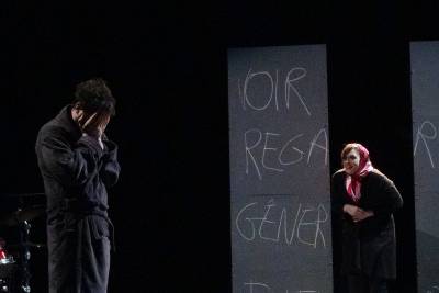Dans cette création collective, on a plusieurs moments de pur théâtre, des saynètes, presque, entre réalité du chemin créatif et imaginaire perché autour du tableau. Mais assez rapidement se pose le problème de la forme. Oscillant entre ces deux versants, on peine à trouver une identité visuelle au spectacle. La présence d’instruments de musique ne trouve pas vraiment sa place, comme celle du créateur son sur le plateau. Et ainsi lorsque ces éléments scéniques entrent en jeu, ils ne semblent ni en lien avec l’histoire de cette troupe face au tableau, ni avec le tableau lui-même. Tout semble fait de bric et de broc, parti pris très intéressant dans la mesure où il reflète la précarité de la création, mais gênant pour entrer dans la fiction. Peut-être cela manque-t-il de beau, ou peut-être simplement d’unité visuelle. Dans l’utilisation de l’espace, dans les choix de mobilier, de disposition.