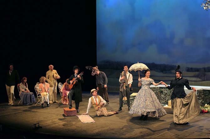 Franchement amusante, l’approche fantaisiste assumée de la scène d’exposition, dans un décor édulcoré propice à la rêverie, provoque volontiers le rire. L’utilisation de la mise en abyme, avec le théâtre dans le théâtre permet une belle mise en perspective des ressorts d’une société narcissique. Pourtant, au fur et à mesure, la comédie se mue en farce, sans que l’on retrouve l’univers propre à Virginia Woolf. Malgré de belles tirades, interprétées par des comédiens qui ont, pour l’ensemble, une réelle présence scénique, le ton glisse inévitablement vers l’emphase, exhibant des personnages sans aspérité.