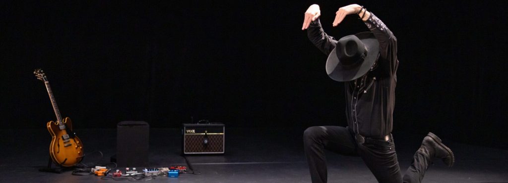 Dead Horse in a Bathtub s’immisce comme un jeu d’enfant avant de poursuivre comme un voyage imaginaire. Nicolas Cantillon, danseur et musicien, homme à tout faire, lonesome cowboy accompagné toutefois de sa guitare, et, en guise d’étrier, d’une pédale looper, crée par ses effets de réverbération sonore un espace immense (dans une salle pourtant bien réduite) comme celui de Monument Valley. Le son qu’il produit, comme la gestuelle ou les situations qu’il joue, reprennent le vocabulaire et l’esthétique du western. La pièce avance donc, dans une parfaite économie, en s’appuyant autant sur sa référence que sur le présent du plateau. Le comique, subtil, s’allie à la grâce. La pièce produit sa poésie dans la superposition des souvenirs des spectateurs, des nappes sonores déferlant sur le plateau et d’une écriture précise du corps. Si Nicolas Cantillon épate par ses capacités ondulatoires, se mouvant avec liquidité, se fondant presque dans le mouvement, les mains atteignent à une expressivité peu commune jusqu’à embrasser la carrière d’un couple de mygales.