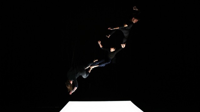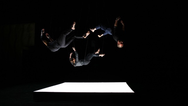 Dehors est blanc se dépouillera de son illusion comme d’un poids trop lourd à porter. Les câbles qui tiennent et portent les danseurs à travers différentes attaches demeureront invisibles, mais les contrepoids apparaîtront sur le quatrième mur du fond. Un envers du décor et de sa magie, le double fond de la boite : la légèreté ne peut s’afficher qu’au prix d’un poids caché. Chaque détachement se matérialisera par la chute du lest et le bruit mat de son écrasement au sol. On se souvient alors d’une pièce de Maguy Marin, Ha ! Ha ! (2006) ponctuée par des chutes de lests tombant des cintres sur le plateau éclatant au sol des marionnettes. Comme un violent et traumatique retour du réel. C’est toute la force de Dehors est blanc de donner à entendre cela après avoir vu cela.