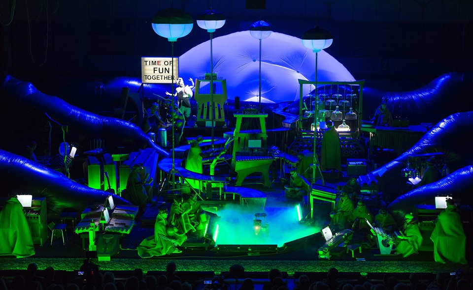 Delusion of the fury est un opéra qui se situe au carrefour de plusieurs influences, du Théâtre Nô japonais à la farce africaine, en passant par la tragédie grecque. Librement inspiré de ces récits et rituels, ce spectacle apparaît comme un récit épique à tiroirs, découpé en plusieurs actes. Sur scène, un gigantesque champ de bric-à-brac sonore s’impose, décor aussi monumental qu’étrange, composé d’instruments inventés, à l’aspect et au son totalement inconnus. Une très belle composition visuelle, où l’œil ne se lasse pas de d’observer la juxtaposition des instruments et des décors. Leur coordination, dans un mélange assez répétitif, laisse le spectateur pantois d’admiration. Les sons se heurtent les uns aux autres, alternant douceur et violence, répétitions et variations, embarquant ainsi l’auditoire dans une rêverie agréable.