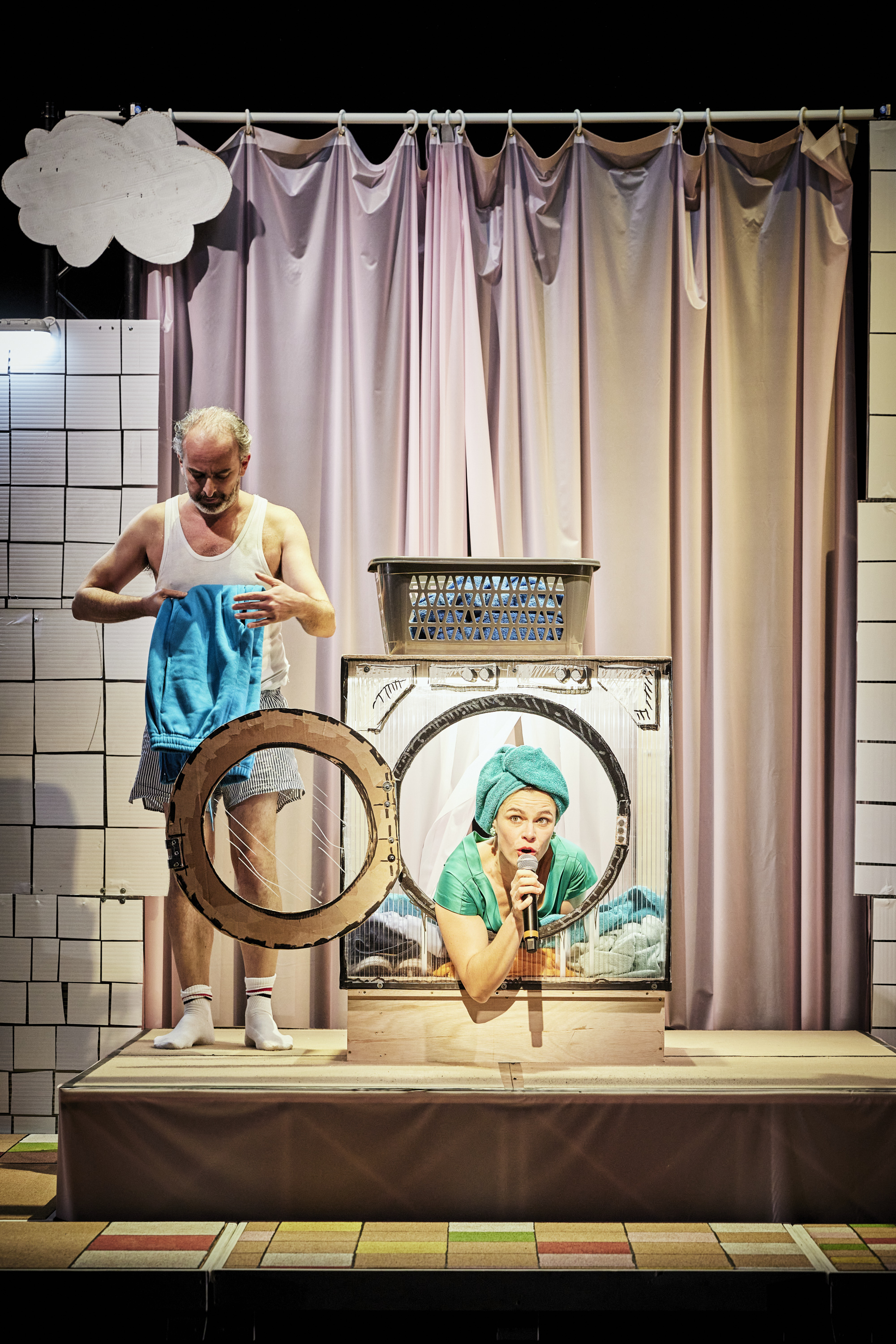 Après le succès des spectacles précédents, on peut dire que la nouvelle création des Filles de Simone était attendue avec hâte et curiosité. Et nous ne laisserons pas trainer le suspens plus longtemps : c’est une jolie réussite, fidèle aux recettes que cette compagnie engagée sait si bien concocter ; une grande marmite de féminisme, des pincées de références historiques et sociologiques, une rasade d’irrévérence, un trait d’humour, le tout saupoudré d’émotion et de délicatesse. Après la maternité, (C’est (un peu) compliqué d’être l’origine du monde), les injonctions et les violences faites au corps des femmes (Les Secrets d’un Gainage Efficace), ce   nouvel   opus   au   titre   aussi   poétique qu’explicite, Derrière le hublot se cache parfois du linge, ausculte cette fois-ci les relations au sein du couple hétérosexuel. Des rapports amoureux à la parentalité, en passant par les tâches domestiques et les habitudes sexuelles, les trois comédien.ne.s font passer le couple par tous les états, pour notre plus grand plaisir mais aussi, et ce n’est jamais loin avec les Filles de Simone, pour dénoncer les inégalités et les conditionnements qui existent encore et toujours.