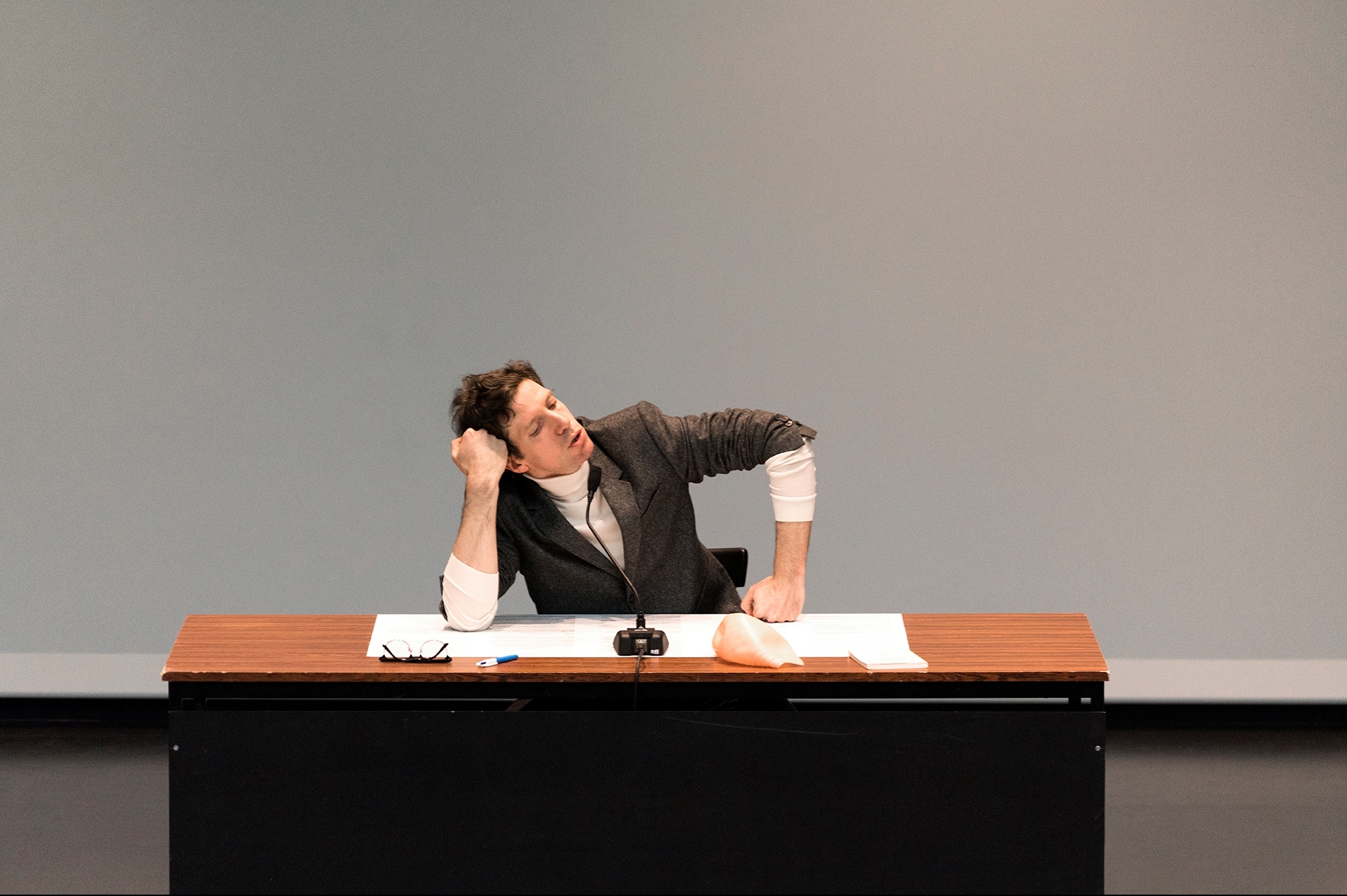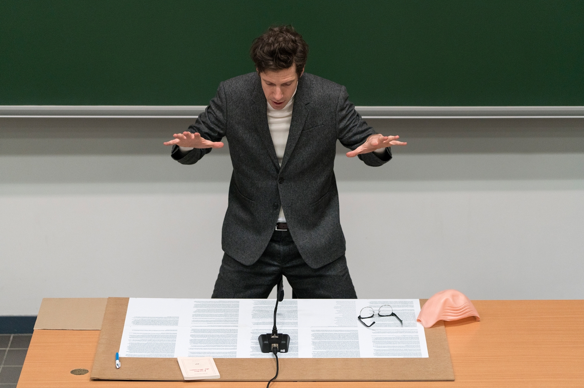 L’esprit chevauche la parole, qui convoque, rappelle, projette, classe, compare, trie, liste. Le corps, quant à lui, en costume et pull col roulé (figure de l’Auteur), se dresse, se soulève, prend position, pour, contre, lève les bras, les pointe, bat des mains, les joint, les écarte, fait d’une main une lunette de vue, monte sur la chaise, la table, se couche sur la table, plonge, nage, traverse, s’en va. Et l’on constate alors avec contentement combien le travail de la pensée peut avoir à voir avec le labeur manuel ! Il y a même une sorte de jouissance pour le spectateur, élève de cette leçon, à observer ce pur esprit ainsi trimer, piocher, couper, abattre, élever, saisir, par ces gestes pleins et entiers, effaçant ainsi symboliquement la différence de classe entre intellectuel et manœuvre instillée depuis la nuit des temps.
