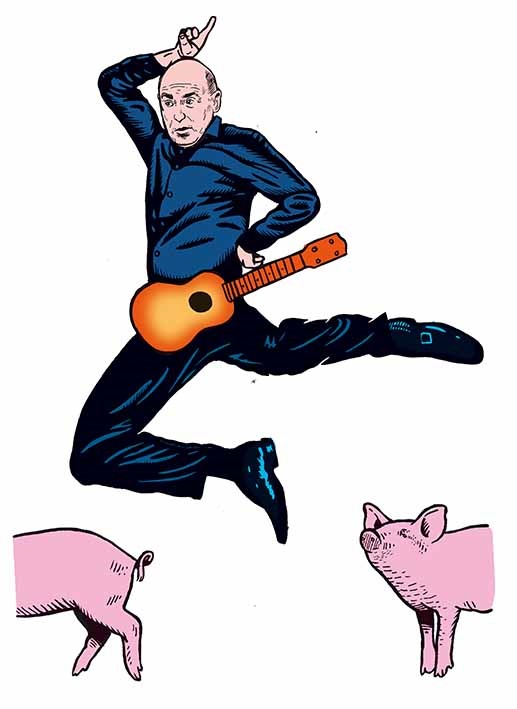 C’est aussi une énergie débordante, une vitalité époustouflante. Le corps de Didier Bénureau exulte. Car ses personnages ont aussi un corps, aussi tordus que leurs coups bas et leurs esprits riquiqui. Didier Bénureau a le génie ahurissant d’esquisser, de définir un personnage d’un geste et de le dézinguer aussitôt dans une explosion de tics et de tocs. De l’essorer, l’étriller pour en tirer non sa substantifique moelle mais sa bêtise la plus noire, sa méchanceté la plus crasse, sa violence intrinsèque et son hystérie. Une hystérie, une folie qui semble hors de tout contrôle. Mais rien jamais de trop. Cette agitation frénétique n’est que le symptôme exacerbé des déséquilibres de ces monstres quotidiens et ordinaires, ô combien tristement ordinaires. Même au repos, tout relatif, quelque chose palpite prêt à bondir comme un diable de sa boite. Didier Bénureau est quelque part entre le Screwy Squirrel et le loup de Tex Avery. Et c’est peu dire que gambadant, sautillant, bondissant comme il le fait il occupe l’espace. Il l’explose littéralement. Il y a un côté rocker énervé indéniable. Et comme jouer du youkoulélé – fort bien au demeurant – doit être un tantinet frustrant, pas pour rien qu’il s’entoure Des cochons dans l’espace, groupe de rockers gentiment allumés qui donne à ce show un ton résolument rock, parfait pour accompagner ces personnages au bord de l’implosion et même carrément explosés