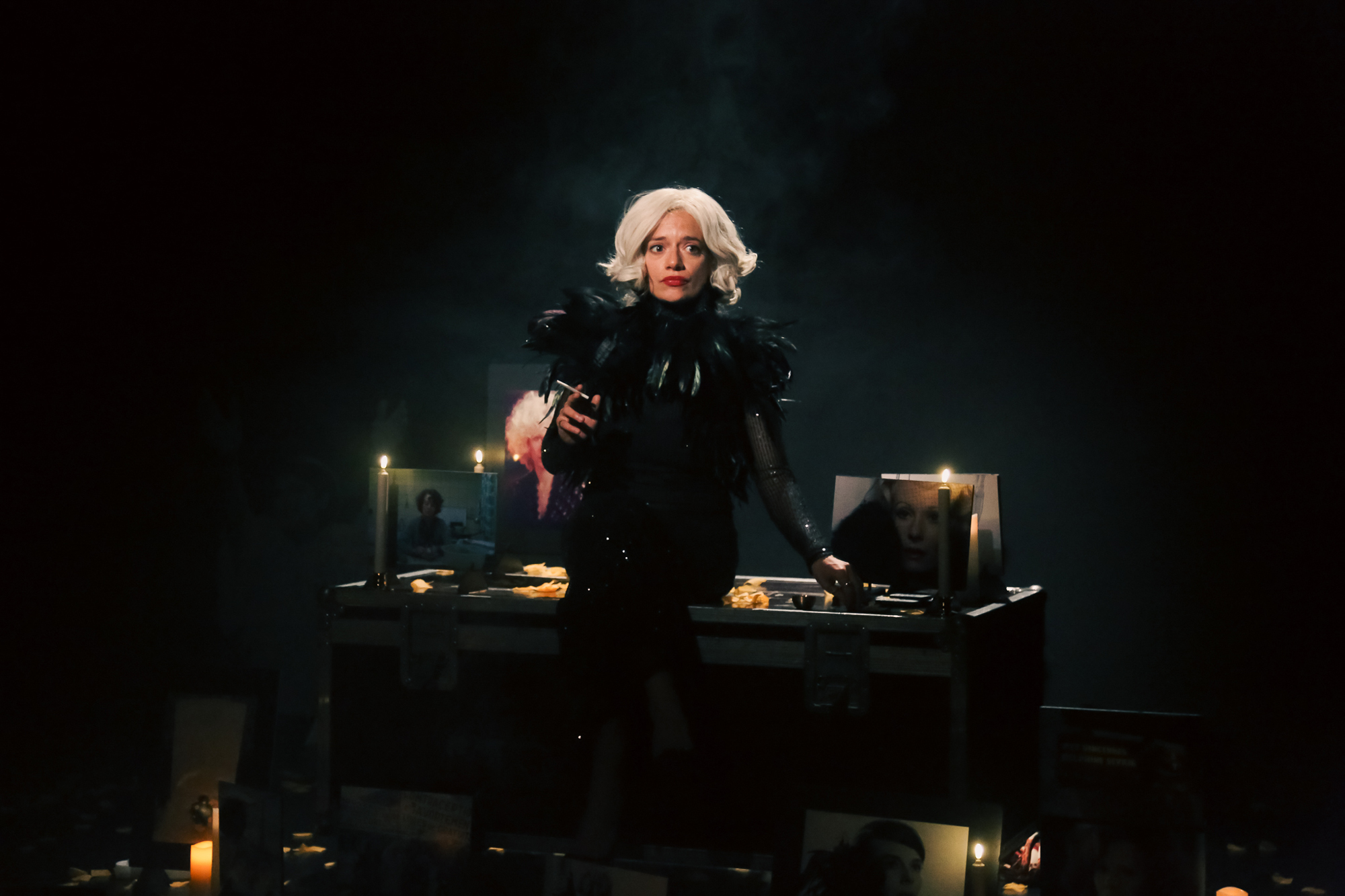 Oui, un plateau surprenant, qui nous promet donc que nous allons être surpris, un plateau qui a raison. Des petites bougies un peu partout, devant des photos de Delphine Seyrig, devant une de ces malles où l’on range et transporte costumes, pourquoi pas mini morceaux précieux de décors, et bien d’autres choses encore. Nous sommes impatients, curieux de cet échange qui va avoir lieu devant nous, entre Delphine Seyrig et Raphaëlle Rousseau, l’une habillée en Seyrig, la seconde en Rousseau. Nous avons hâte.
