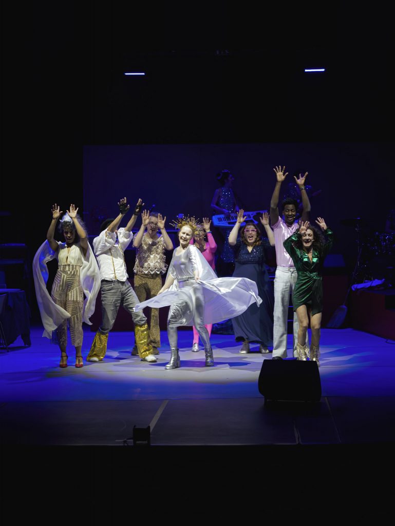 Les déguisements vont et viennent, les personnages s’affirment, se mêlent et s’emmêlent sur une chorégraphie signée Jeanne Alechinsky. On pourrait s’attendre à un spectacle aux rebondissements joyeux, oui, c’est un peu ça, la danse explose, les déguisements farfelus et brillants recouvrent tous les personnages, les musiciens, ou les musiciens-personnages. Un résultat qui aurait pu déborder de positivité mais qui malheureusement, à force de répétition, lasse. Un texte trop vague, pas assez net ? On veut nous montrer la ruse du loto lassant, c’est parfait. La musique est excellente, oui, mais les chants ne glissent-ils pas parfois, comme s’ils avaient raté une marche ? D’où peut venir cette impression face à une équipe talentueuse ? Mystère ? Non, une mise en scène réaliste et si plate qu’elle n’illustre pas assez bien la platitude morne dans laquelle ces minorités, tâchant de se remuer un rien, sont enfermées et essaient de se rejoindre pour réussir à croire qu’ils participent finalement à une vie moins lassante. Diskoteekki fait sourire parfois. C’est déjà ça. Pas grand-chose de plus.