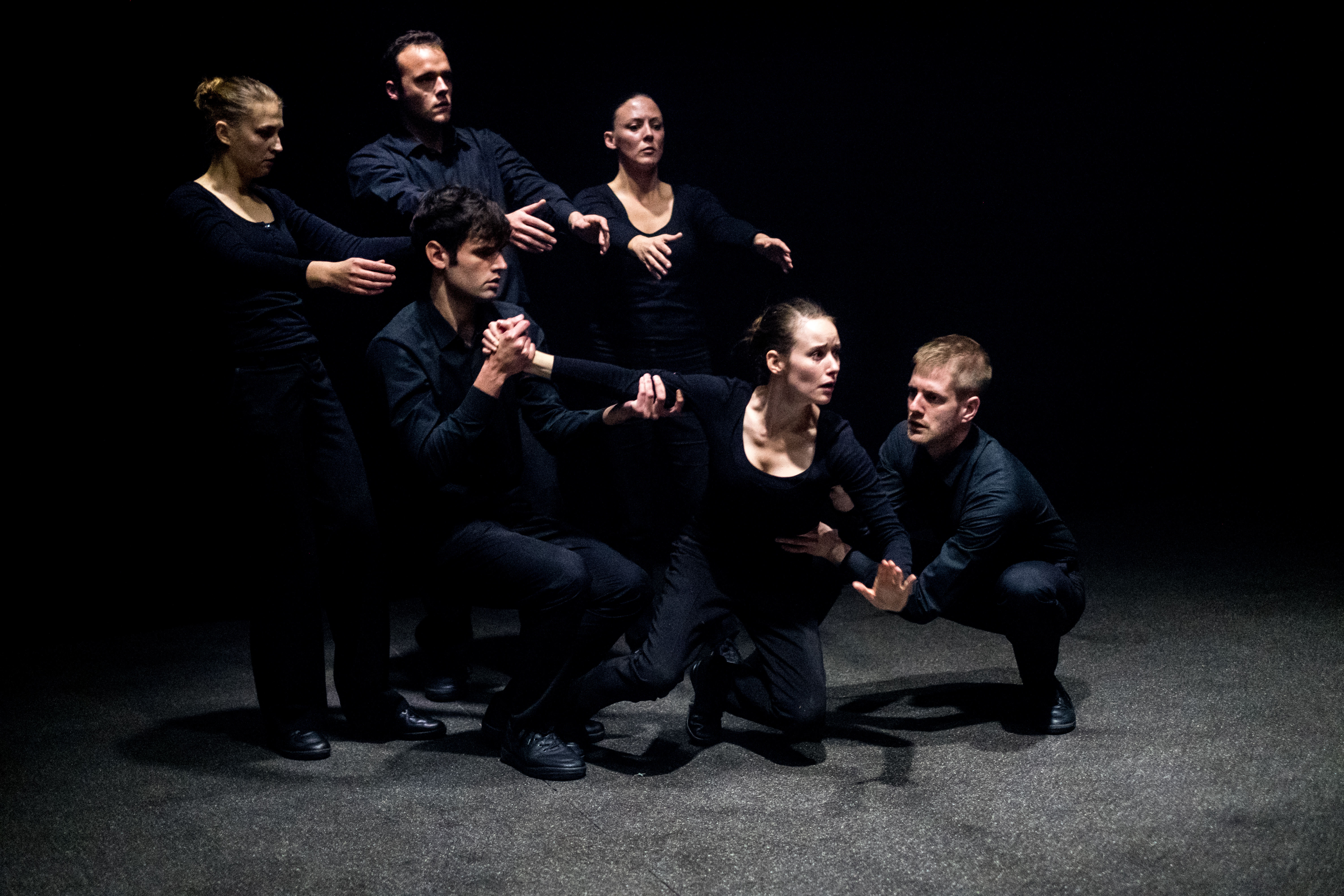 Nous entrons dans un monde à part, terrible sans doute. Pas vraiment le temps de papoter en s’asseyant, nous sommes tout de suite plongés dans une brume austère, trace de douleurs passées mais si présentes. Là, sur scène, nous attendant et apparaissant peu à peu sous les volutes s’effaçant, six individus, six aux identités partagées, répétées, qui nous racontent ici un (un seul ?) attentat dans le métro russe. Douleurs, terreurs, morts et sursauts, les corps rebondissant ou s’écrasant les uns contre les autres, construisant l’image de l’incompréhensible, ou tâchant de le faire, le tout à travers une souplesse et une légèreté lentes, ralenties, décomposées. Premier coup de poing, invitation surprenante à écouter, regarder, sentir, du moins tenter de le faire face à cette douleur qui va s’étendre devant nous, goutte à goutte ou dans l’éclat terrible du trop tard.