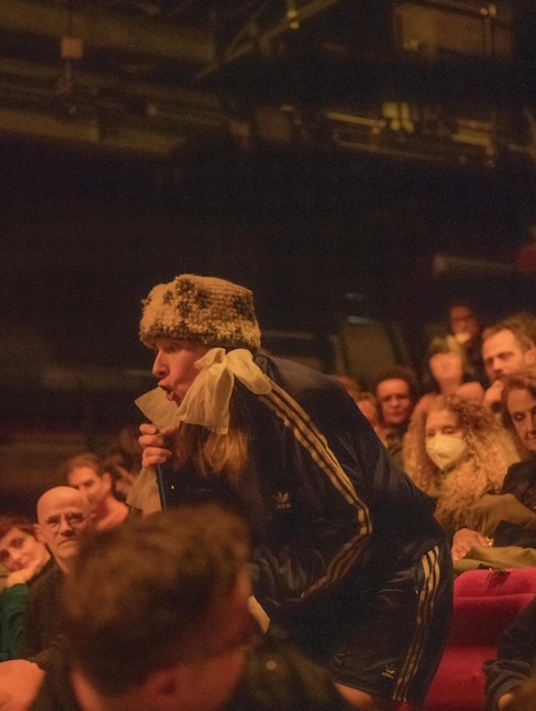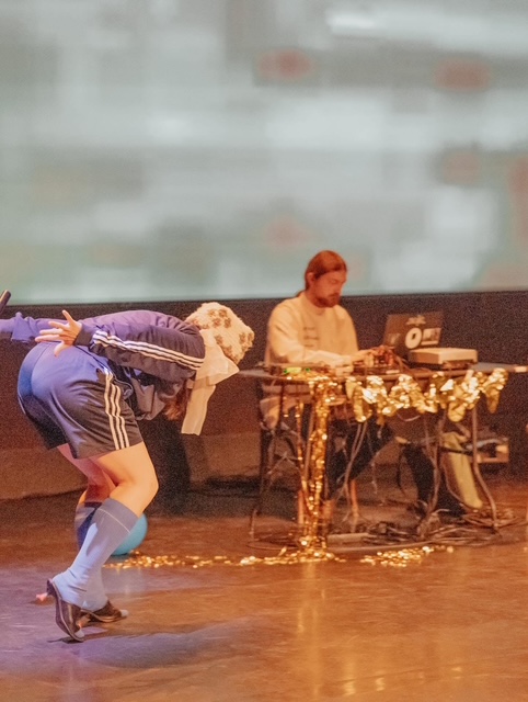 C’est d’abord un son que cette genèse d’un monde disparu. Une rythmique, une sismique, un tremblement qui enfle et s’empare du corps adolescent, poupée à couettes et toque, incarnée par Yulia Arsen, short et veste synthétiques d’un survêtement bleu Adidas, chaussures à talons rouges. Le son est celui d’un autre temps et d’un ailleurs : la pop rock post soviétique des années 90 et la Russie orpheline de l’homme rouge. Dans le déferlement de ce tonitruant maelström, les images vidéo projetées en fond de scène se floutent et pixelisent progressivement jusqu’à ne plus être qu’une indistincte lande déserte post industrielle striée de lignes à haute tension. La jeune fille, mouvements saccadés, animés malgré elle par l’onde chaotique qui se déverse sous les manettes du DJ régisseur de son, crisse par son sourire freaks. Dans la crispation du masque du visage souriant, quelque chose d’une possession, quelque chose d’une époque révolue qui se bousculerait et se presserait contre une vitre, grimaçante. Yulia Arsen danse une mémoire contrariée, pleine de vents contraires la bousculant, la renversant. Elle se tord et se distord, le temps passé n’en finit pas de passer et de ressasser comme un courant électrique électrocutant sa proie. Elle est tour à tour et à la fois écolière, gymnaste, patriote, danseuse, pensive, inhibée, exhibée, joyeuse, religieuse, … elle est l’enfance soumise aux injonctions, elle est le monde soumis aux forces politiques qui le secouent. Elle est le sample des années déchues. La performeuse échantillonne les gestes du passé, comme on ferait un carottage psychique. Sa pièce est un vaisseau spatial où nous sommes embarqués à remonter le temps, le corps de Yulia Arsen, notre sonde, instrument de mesure de la violence de cette autre époque qui infuse encore dans la nôtre.