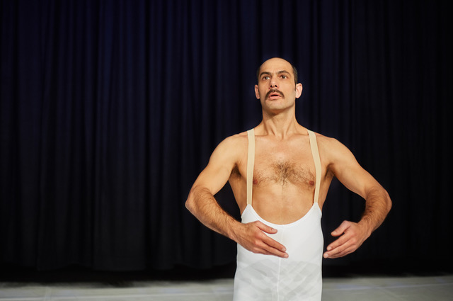 Les pas de danse, esquissés d’une variation à l’autre, font preuve de détachement : façon à la fois de détourer, détacher, un membre, un muscle et de le laisser mener sa danse, mais aussi de se regarder soi-même faire et d’en sourire. Il est son spectateur et c’est aussi ce face à face que nous observons. S’il est danseur, il est autant comédien dell’Arte : ses mouvements, ses gestes sont emprunts de la grammaire fortement expressive de ce théâtre-là. Et cette expressivité est aussi celle qui transparaît dans chacune des variations de Bach , faisant ses gammes de sentiments et d’intentions variés : ainsi cette danse furtive à pas de voleur, ou cette autre à tomber à la renverse comme un arpège qui s’écroule. Ces couleurs, profondément humaines, contrastées de la joie à la tristesse, sortes de caractères, que déploie la palette des Variations Goldberg, Yaïr Barelli les met en jeu dans une danse des affects et les tient à distance, comme en laisse, avec ironie : « c’est un théâtre et ça rend visible la danse » nous aura-t-il dit un peu plus tôt. Comblée d’une énergie brute, emportée par ce corps musculeux et facétieux, parée d’une moustache de gymnaste des Années Folles ou à la Freddy Mercury (c’est selon), soulignée d’un regard qui se maquille de l’ahurissement pour mieux nous saisir les yeux, sa danse de l’être est un perpétuel et joyeux devenir comme la musique de Bach.