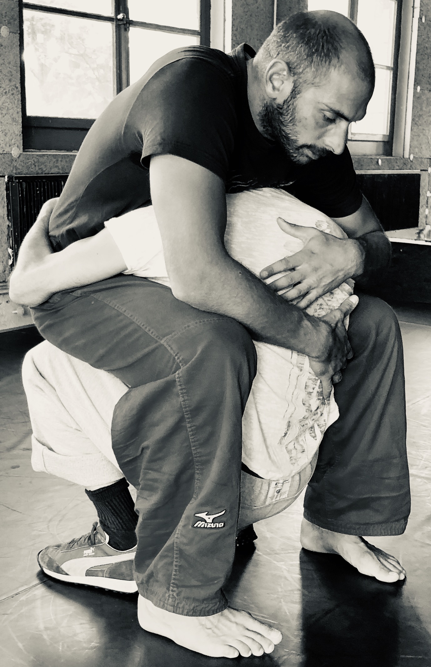 L’alliance de la carpe et du lapin. Soit un grand échalas (Valentin Pythoud, porteur-acrobate) et une crevette (Marco Delgado, danseur-performeur) pour un-pas-de-deux poétique, un jeu de séduction ironique. De poses plastiques en référence aux antiques grecs comme aux super-héros Marvel, tout est une question d’attitude, bruitées d’hilarantes stridulations, poses qui se répondent en un singulier défis, avant que les corps bientôt ne se confondent, ne s’embrassent. Très vite ce qui aurait pu être un combat de coqs se métamorphose en une parade amoureuse subtilement homo-érotique de deux drôles d’oiseaux se jouant caustiquement de leurs différences affichées. On se cherche, on se trouve, on s’empoigne, on se porte, on est porté, jeu de main jeu de vilain, on vacille et on « tangote » enfin, on s’étreint. C’est truffé de références plastiques et chorégraphiques, abécédaire de possibles variations, de détournements incongrus. De la piéta de Raphaël à Boris Charmatz, croit-on, c’est un vocabulaire revisité à l’aune de ces deux corps-là si dissemblables et complémentaires, qui se mesurent, se défient avant de trouver leur équilibre, certes de guingois mais fermement tenu. L’union fait la force, on peut dire ça, et ces deux en font une démonstration éclatante que signifie leur emboitement final, ce gros câlin où ils ne font plus qu’un ou presque. Plus sérieusement, un mouvement en entraînant un autre, de métamorphoses en métamorphoses, c’est un véritable atelier ludique qui voit les codes de la représentation classique balancés et déclinés non sans humour, cul-par-dessus-tête, mis au défi d’une réalité morphologique hors des standards usuels et dont ils se jouent avec un bonheur malicieux évident et pas mal d’à-propos…