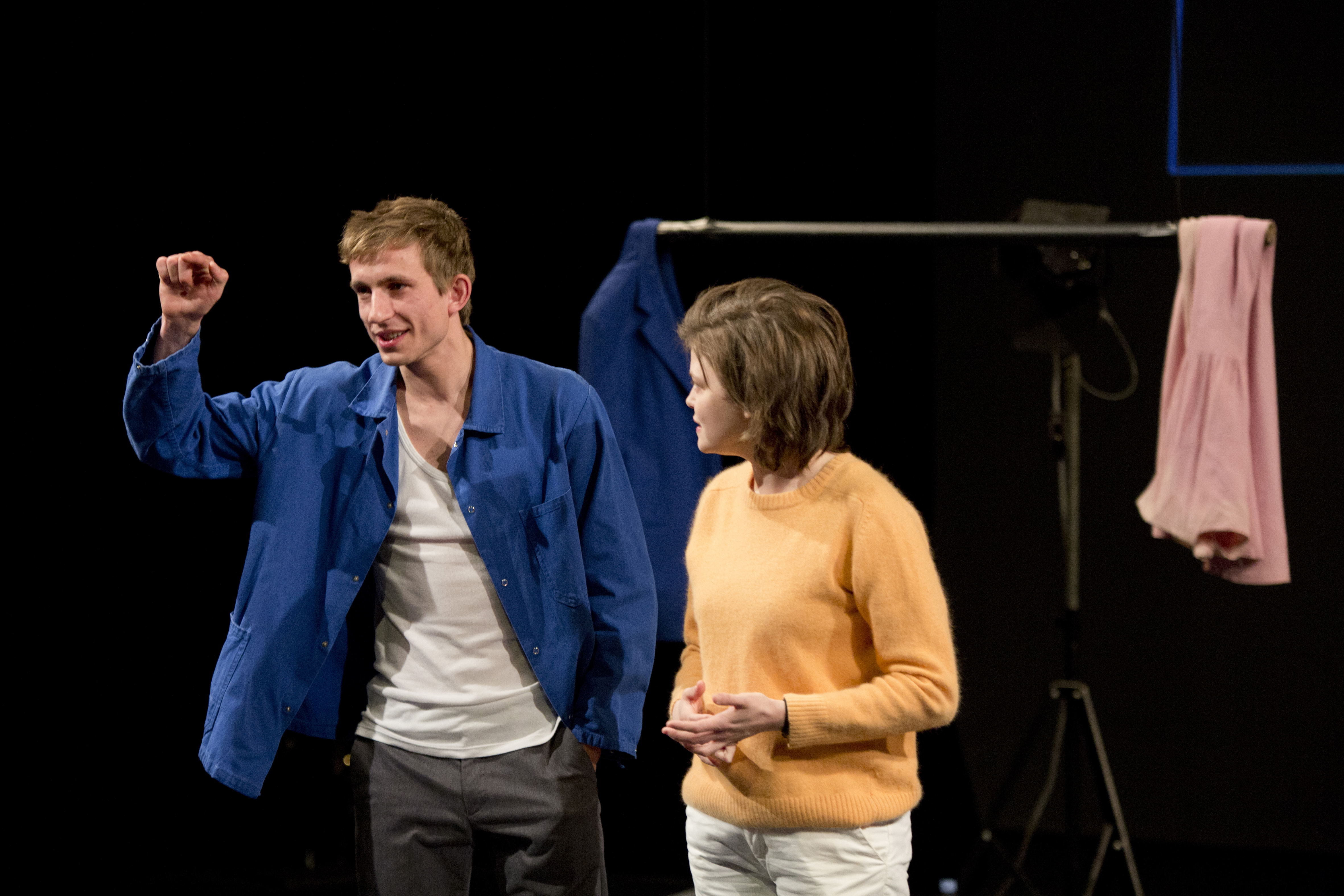 instruction par instruction, depuis la mise en marche de l’appareil photo, le choix du sujet, le cadrage, jusqu’au développement et à la fixation de la photo, tandis que les deux comédiens, ainsi dirigés, progressent dans un processus expérimental séquencé dont ils sont manipulateurs et cobayes à la fois. A titre d’exemple, le cadrage se décline sur scène comme le cadre : l’explicitation de toutes les limites et contraintes qui s’imposent à ce spectacle-là : dimensions de l’espace de jeu, conditions de production, limites que les comédiens ne souhaitent dépasser dans leur travail…