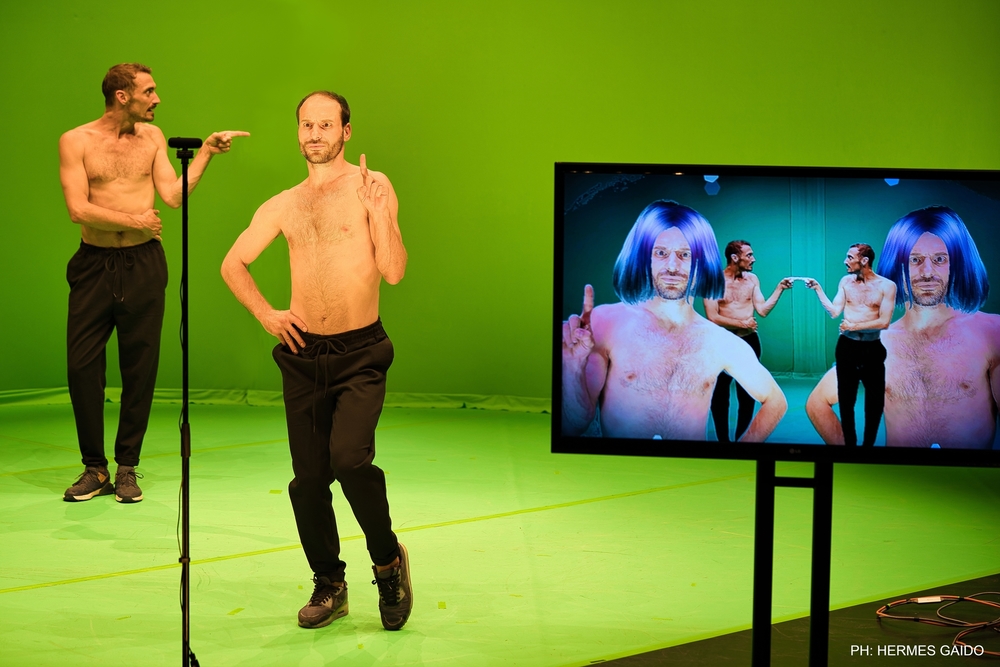 Par le truchement d’une émission de télé aseptisée présentée par Alfonso et Luciano eux-mêmes, grimés en caricatures de femmes, le spectacle prend alors un tour technologique étonnant et se mue en une performance de synchronicité des corps, des tempos et des voix. Alfonso et Luciano se mettent ainsi dans la peau d’une myriade de personnages grâce à des filtres successifs. Les deux artistes se lancent dans une succession haletante de tableaux déjantés. Sont abordés de nombreux thèmes épineux de société, l’addiction aux écrans, le pouvoir des influenceurs, les soi-disant experts, les réactionnaires…