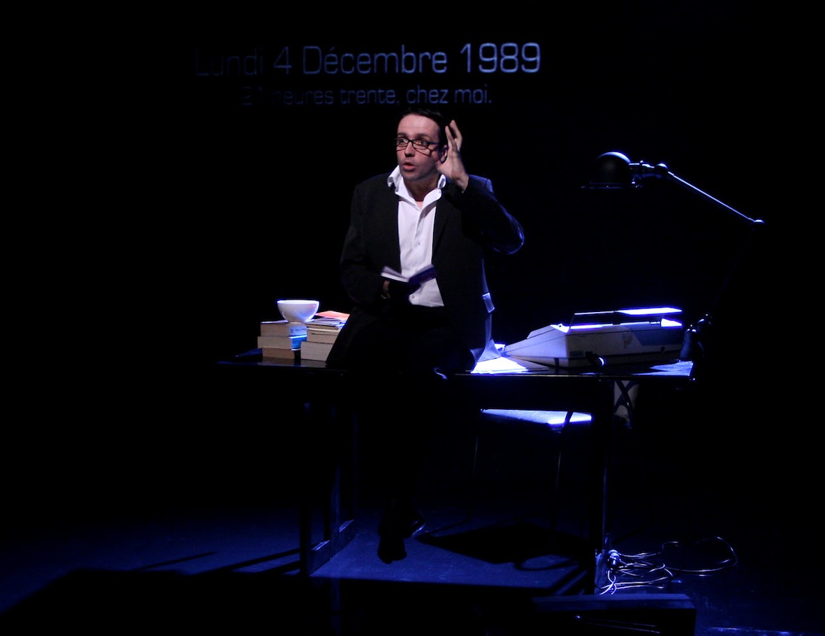 Le metteur en scène François Berreur a su trouver un acteur capable d’incarner avec justesse un personnage complexe, maniant humour, ironie et sensibilité. Un comédien en scène : Laurent Poitrenaux, pieds nus, costume noir et chemise blanche ouverte, assis derrière un bureau sur lequel sont posés une machine à écrire et des livres et au sol une malle et des disques ayant appartenu à J.-L Lagarce. Voilà pour le décor. Quelques musiques : Richard II 40 par Colette Magny, De temps en temps par Joséphine Baker et I love Paris par Ella Fitzgerald, les musiques préférées de Lagarce. Sur le mur, une vidéo fait défiler les notes de Lagarce, peu de mots mais beaucoup de morts, une sorte d’inventaire à la je me souviens de G. Perec. Cioran, Hervé Guibert, Coluche…Même seul dans sa chambre, Lagarce/Poitrenaux est en connexion avec le reste du monde, tout du moins, avec toute la salle. Laurent Poitrenaux, quarante ans, n’a pas connu Lagarce mais sait réinventer les notes de cet auteur avec une très grande justesse, sans tomber dans le pathos, même à l’approche du dénouement. Il sait également retenir l’attention du spectateur dans un échange empli de tendresse et de sincérité. La mise en scène nous invite chez Lagarce, mais cet univers pourrait bien se situer chez nous.