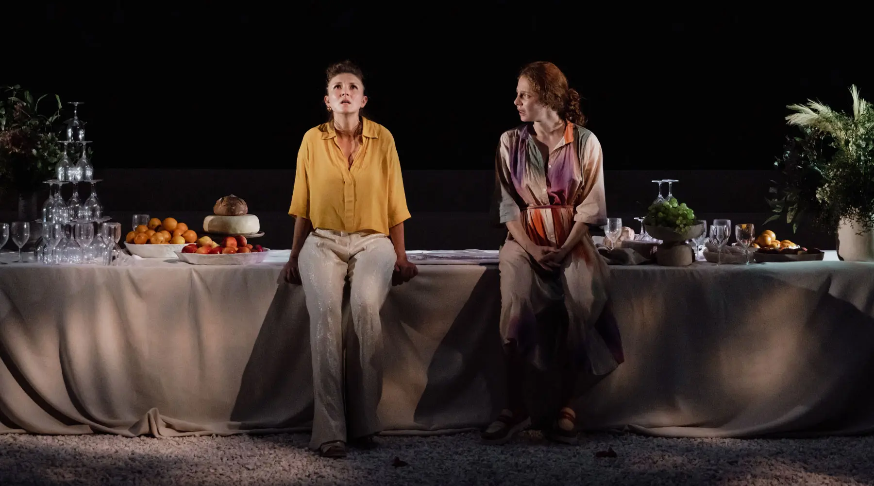 La curiosité m’anima, et un puissant désir. Désir de poésie, désir d’entendre aussi d’autres voix que la mienne clamer ces textes sur d’autres scènes. Voilà ce qui m’amena à ce qui se présente lors de notre entrée dans le TPM comme une fête impromptue : une longue table, des graviers blancs, le brouhaha des conversations. Trouver sa place, prendre des nouvelles, s’observer dans la foule bigarrée. L’entrée du public se confond avec l’entrée des invités de la fête. Pauline Bayle instaure un principe d’homothétie, un jeu de miroir, entre régime de fiction et régime de réalité, procédé qu’elle reprendra d’ailleurs au cœur du spectacle. Pour cet accueil, les acteurs rivalisent de bonne humeur, font des moulinets avec les mots comme s’ils cherchaient à s’enflammer, et nous avec. La facticité émaille l’artefact mais l’on se chauffe petit à petit à cet irrésistible foyer. Écrire le plateau c’est ainsi croire ensemble, acteurs et public, à une fable, la coudre des fils blancs de la connivence. Domestiquer l’inconnu en chacun. C’est retrouver cette part crédule de l’enfance, c’est recouvrer la fraicheur de cette naïveté. C’est être ensemble.