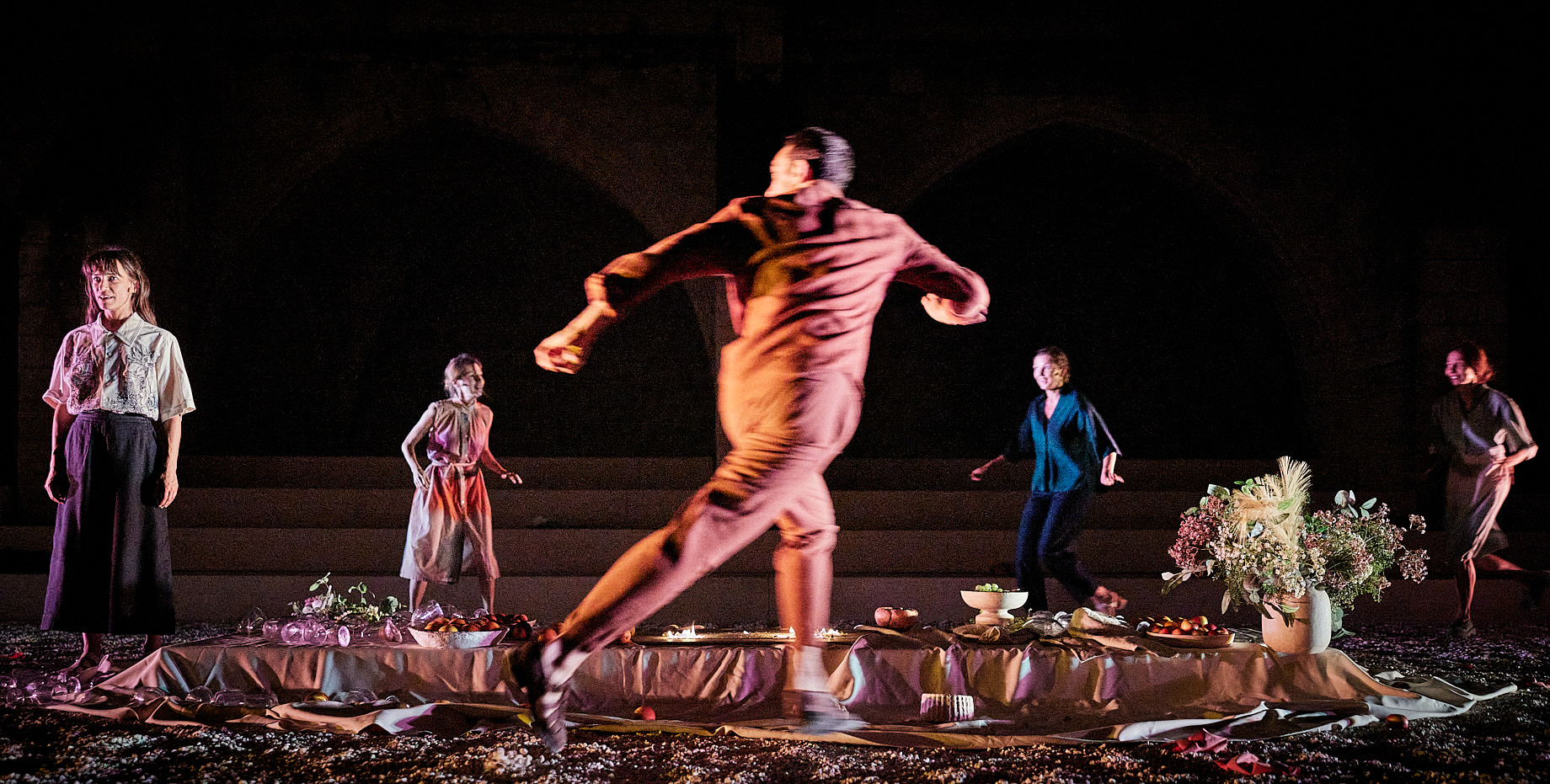 Deux parties vont se succéder, la jeunesse solaire précède la maturité avec ses deuils et renoncements, le temps passe dans un firmament de soie qui vire au clair-obscur grâce à la belle lumière de Claire Gondrexon. Chaque personnage est singulier, ensemble ils composent une bande, un seul corps, toujours collés les uns aux autres. Les moments chorégraphiés où les personnages jouent à chat, s’élancent dans une même énergie, font naître cette sorte de pattern autour d’une conscience centrale, d’un instinct de groupe presque animal. Malheureusement l’ensemble manque de souffle, le texte de Pauline Bayle paraît souvent artificiel, s’enlise dans une logorrhée interminable, et la pièce patine en dépit de comédiens magnifiques d’élans brisés, d’une chorégraphie parfaite et d’instants étincelants. Les références à la pandémie n’apportent rien.