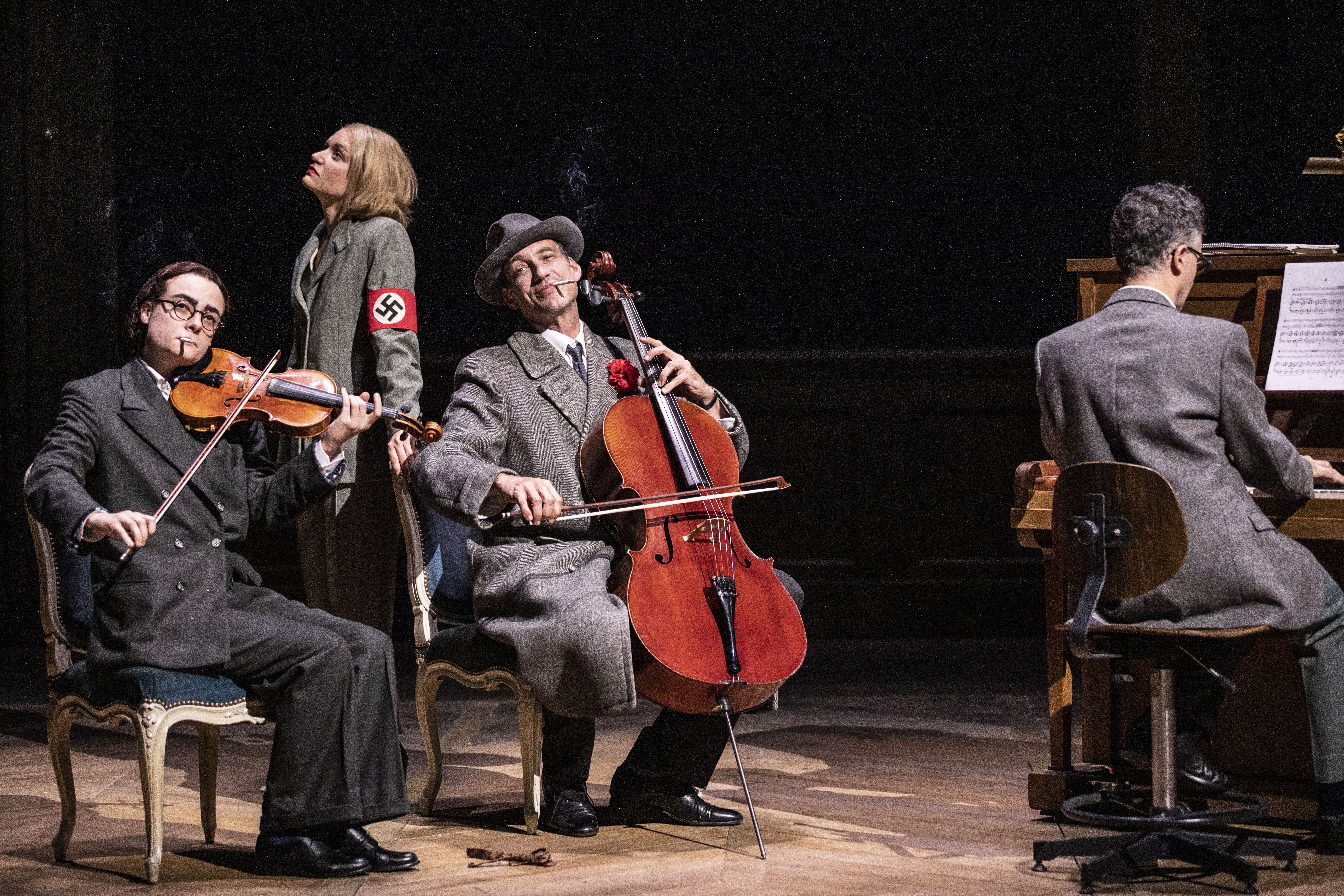 Seulement le choix du burlesque, du grotesque ne fonctionne pas ici. Ce qui louche ouvertement vers Brecht reste en dessous de son modèle. Nous sommes dans un entre deux inconfortable, comme si Sylvain Creuzevault d’ordinaire plus audacieux, plus franc du collier, voire plus trash, avançait sur la pointe des pieds, embarrassé par son sujet qu’il maîtrise mais ne parvient pas à mettre en forme. « Regarder la barbarie autrement qu’avec les yeux de l’effroi » c’est comme faire de la littérature avec des bon sentiments, cela ne suffit pas toujours. Faire des personnages aussi complexes, parfois contradictoires comme Lucien Rebatet, des « grimaces », tombe à plat. On ne peut résumer ces « petites merdes », pour lesquels nous n’avons aucune empathie, à ces pantins gesticulant, bouffons réduit à des salonnards glosant sur la décadence de la société en jouant du violoncelle. Difficile d’en faire des salaud sympathiques. Difficile d’en rire. Alors on ne rit pas, ou si peu. Pourtant les comédiens sont tous exceptionnels qui tentent d’éviter la lourdeur caricatural de « la grimace » pour leur apporter une profondeur à défaut d’humanité ou d’héroïsme. Mais le discours de chacun résiste à la théâtralité, du moins à celle-là, rétif à la représentation qui en est donnée, la farce. Malgré nos réticences quand à la forme, le mérite de cette création est de mettre au jour les mécanismes propre à la montée du fascisme que résumait Brecht : « Le fascisme n’est pas le contraire de la démocratie mais son évolution en temps de crise ». Le fascisme, mal de notre siècle, ne peut pas mourir écrivait Robert Brasillach. Sombre et juste prémonition.