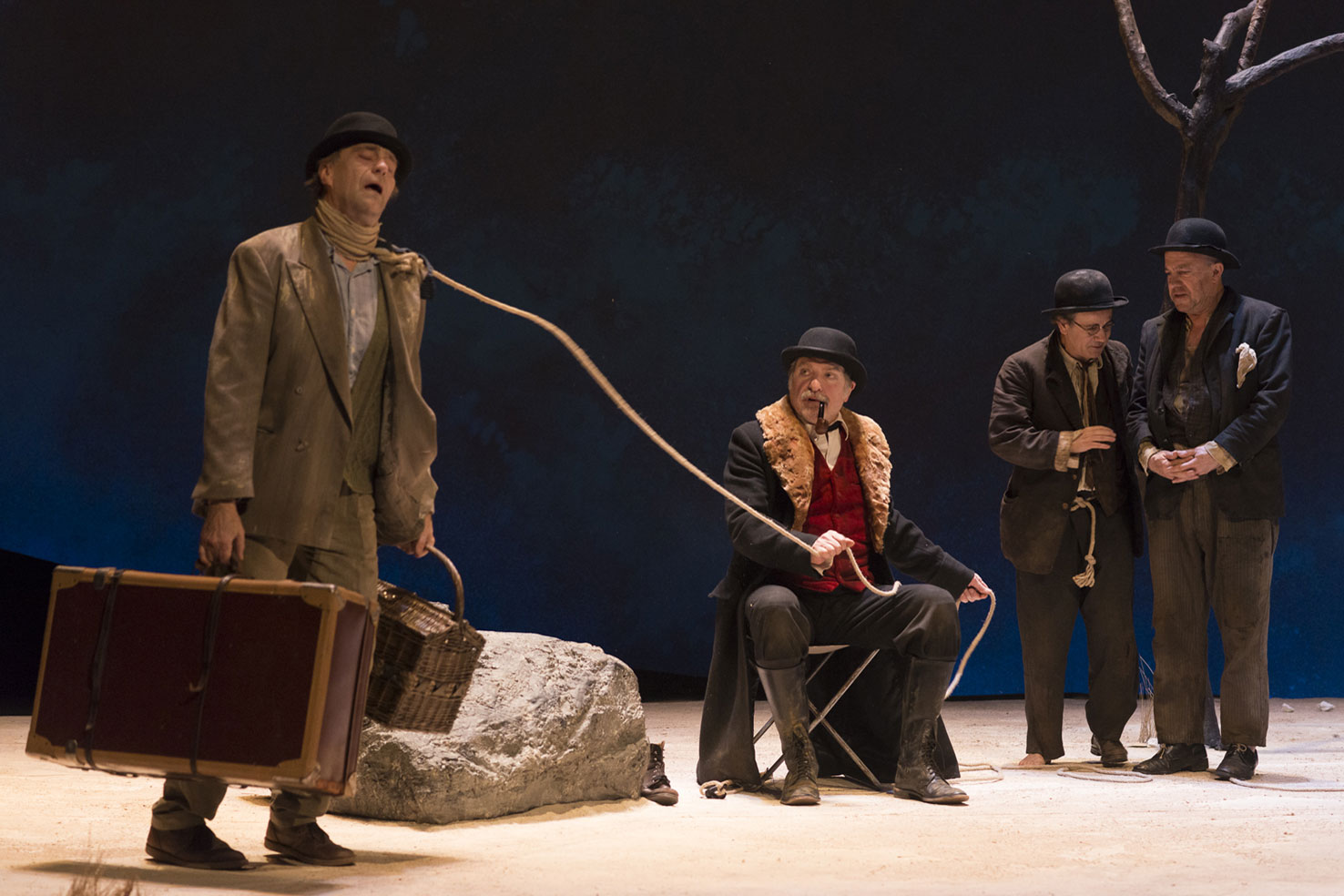 Les personnages de Vladimir et Estragon, interprétés respectivement par Charlie Nelson et Abbes Zahmani forment un merveilleux couple à l’image de celui de Laurel et Hardy comme en témoigne la note d’intention de Jean-Pierre Vincent. C’est un duo de clown au vrai sens du terme tout en subtilité et en douceur qui nous est donné à voir. Le spectateur ne peut qu’être touché par cette vérité et cette humanité qui émanent de l’interprétation des comédiens. Face au vide de l’existence le besoin de l’autre va toujours croissant, partager ses douleurs et ses interrogations est l’unique façon de se sentir vivre. Vivre à travers l’autre, voilà exactement ce que de grands comédiens font chaque fois qu’ils jouent ensemble. L’arrivée de Pozzo, grand propriétaire terrien et esclavagiste interprété par Alain Rimoux est un véritable événement. Celui-ci fait du personnage de Pozzo un être absolument égocentrique, à l’écoute des variations de sa voix de crooner, et apporte un comique d’une autre nature avec un jeu volontairement grandiloquent. La corde qui lui permet de « tenir en laisse » Lucky, interprété par Frédéric Leidgens, est le signe de l’asservissement de l’esclave au maître mais également du maître à l’esclave. Lucky blafard et vacillant nous fait voir toute la douleur de l’humanité, l’épuisement face à la souffrance physique et psychique. D’un côté nous avons le clown blanc avec Lucky et de l’autre l’auguste avec Pozzo, et là encore c’est un duo clownesque revisité qui fonctionne à merveille. La violence et la cruauté du texte de Beckett résident principalement dans cette scène où Pozzo et Lucky font irruption : Vladimir et Estragon passent de l’indignation à la vue d’un Lucky « en laisse », à l’amusement que celui-ci peut leur procurer quand Pozzo lui ordonne de danser et de penser. La mise en scène permet ici de mettre en lumière toute la faiblesse humaine et la cruauté provoquée par l’insouciance. Le jeune Gaël Kamilindi qui apparaît en jeune garçon semble plus une rêverie de Vladimir qu’une véritable incarnation, une sorte de Pierrot lunaire qui serait une extériorisation de la pensée de Vladimir. Il laisse le spectateur rêveur et l’interrogation ouverte sur l’existence de Godot.