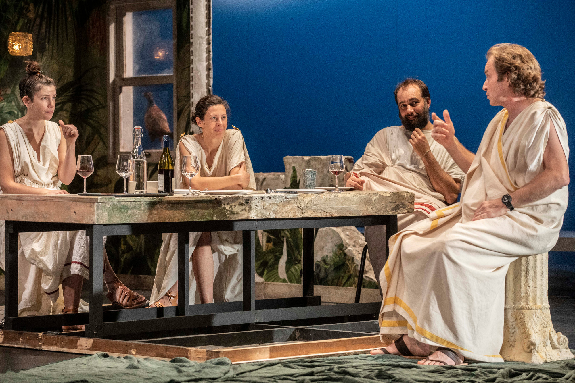 Voilà une création abrasive qui vous râpe salement et finit par vous gratter sévère. L’Avantage du doute interroge notre humanité en plein effondrement et comme à chaque fois soulève nos contradictions comme on soulève un lièvre de mars. Pas de réponse de leur part mais un inventaire à la Prévert où ne manque pas un ours blanc. Patriarcat, productivisme, capitalisme, esclavagisme, exploitation des femmes, féminisme, écologie… L’effondrement est partout qui se répercute jusque dans l’espace privé, intime. Et ce qu’il souligne là c’est combien tout cela est étroitement lié, comment tout se tient fermement, et que chaque solution, pragmatique ou utopique, se heurte toujours à ses propres limites et contradictions internes. Comme le résume magistralement l’un d’eux, « c’est la fin du monde et tout le monde regarde top chef ! ». Oui, c’est tragique, la maison brûle, et ce collectif en toge pour l’occasion, regarde les braises chaudes avec une lucidité imparable, faisant feu de tout bois idéologiques. Pas trash, non, mais cash sûrement. C’est d’un humour mordant et féroce, écrit finement d’une plume trempée dans le vitriol, qui vous balance ses quatre vérités sans s’embarrasser du politiquement correct. Mis en scène avec brio, loin d’être foutraque, tout est amené avec le plus grand naturel du monde. Avec ça, une autodérision, parce que toute réflexion ici part avant tout de l’expérience de ce collectif hors-norme. On le sait, parler de soi c’est aussi parler du monde. Et le théâtre ici est une étrange et formidable agora, pour preuves ces colonnes gréco-romaines tronquées et ces toges incongrues qui font de la scène un espace de débat, un banquet platonicien où le sérieux le dispute au dérapage contrôlé, voire même à la poésie surréaliste. Et si le public est muet, on ne parle pas des rires qui le secouent au long de cette création, il n’en est pas moins interpellé, passé à la question lui aussi. Résumer le tout tient de la gageure tant l’ensemble est habilement troussé, joyeusement secoué, les sujets tissés, cousus entre eux sans fil blancs ni couture apparente. C’est drôle, de cet humour salvateur qui du pire donne le meilleur, fait passer la pilule amère qui n’est pas ici un placébo.