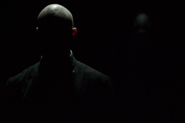 Seul dans l’obscurité de la scène, Thomas Bouvet incarne cette silhouette. Immobile et confiant, il nous livre ce qu’il voit, ce qu’il imagine de ces corps aimants. L’innocence de ces deux enfants se mêle à l’étrange. Rasé et enveloppé d’une robe noire dénuée de signe distinct, le personnage n’est ni un homme, ni une femme. Cela pourrait être Dieu, ou Satan, et l’on pourrait d’ailleurs douter de son existence. Climat de doute et d’ambigüité qui nous maintient accroché à chaque mot du texte.