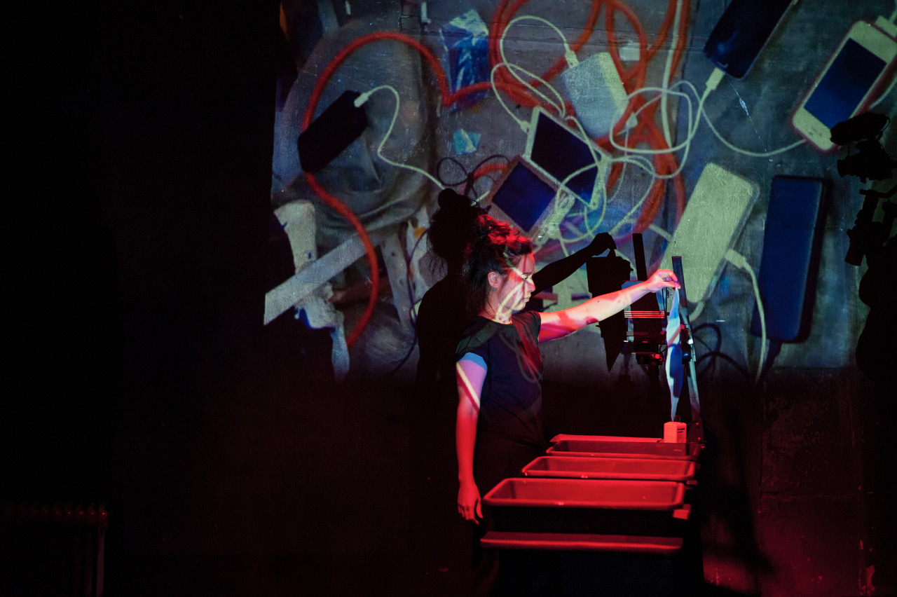 Un comédien et une comédienne soutiennent ces « voix écrites » et autres symboles comme les sourires, les cœurs, les doigts croisés. Ils font le chemin entre Damas et l’Allemagne. À côté d’eux, très présente et à la fois dissimulée, ici et là en quelque sorte, une femme tire des photos, façon argentique, pour nous faire suivre aussi ce chemin, périlleux, long, inattendu.