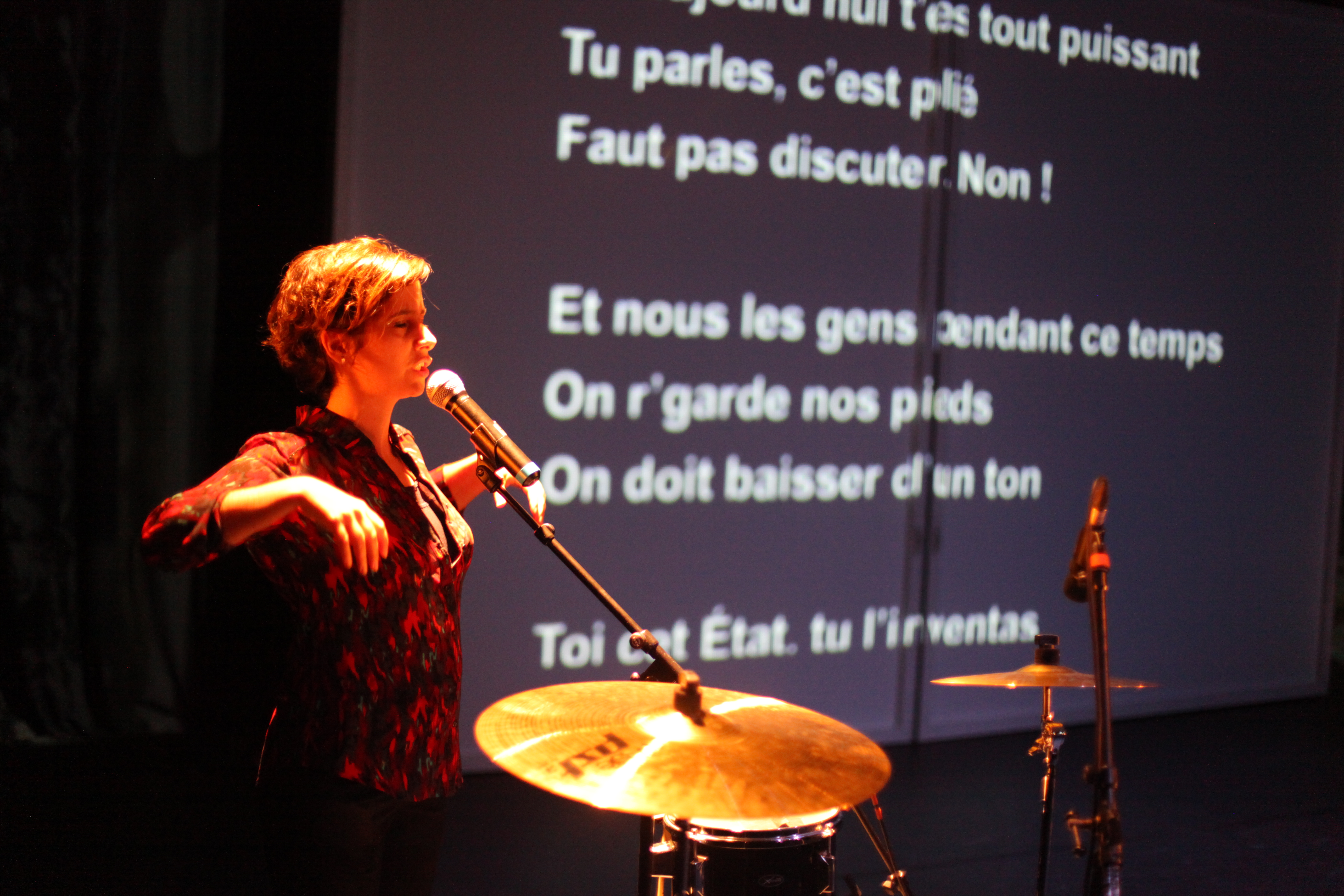 Une intention sincère et fondamentale, un geste personnel qui ose chercher sa propre forme ; un résultat peu convainquant. ça arrive mais c’est aussi un mérite. Le point le plus faible est sans doute le texte lui-même dont le ton hésite, plutôt qu’il ne navigue, entre émotion et distance, engagement et retenue bienséante. Les mots ont peine à percer et à se faire entendre, noyés dans une prosodie lourde, des rimes attendues et lancinantes et (pourquoi ?) dans la phraséologie bien-pensante issue tout à la fois du manuel de l’éducateur bienveillant et des programmes-cadres institutionnels, ceux par exemple des « interventions artistiques ». Cela se voudrait-il une distanciation permettant d’élargir le prisme, de l’histoire personnelle vers le fait de société ? Elle est si plaquée qu’on ne sait qu’en faire. De même, il y a une ambivalence non assumée du rôle de l’artiste intervenante, adulte et mature mais avec un cœur et une voix aux accents adolescents. C’est pourtant peut-être l’endroit le plus touchant, là où les deux personnages principaux, Thissa parlante et Idir absent, se rencontrent, dans un amour en creux et une admiration réciproque omniprésente qui réussit à ne jamais dire son nom. Cet espace, pourtant alimenté par la partie non textuelle — les sons, la musique, la vidéo du petit garçon et de la petite fille jouant dans le parc et vivant leurs émotions, qui accompagnent le spectateur d’un bout à l’autre —, est resté timide et les chansons, où le récit cède la place à une parole à la première personne, trop en façade — parade ? Cela, alors même qu’il faut reconnaître à Escape game un engagement politique rafraîchissant, à l’écoute de la beauté « invisibilisée » des individus, portant au centre de la scène, à la matrice, les écrits, les dessins et les voix des lycéens rencontrés ; un processus qui reconnaît non seulement les destinataires mais aussi la démarche elle-même de l’intervention artistique. Sur le thème « comment le patriarcat traverse nos vies », un grand merci au propos qui ne se révèle ni marchand, ni larmoyant, ni simpliste, ni réducteur, ne serait-ce qu’en prenant pour sujet la violence faite aux… hommes !