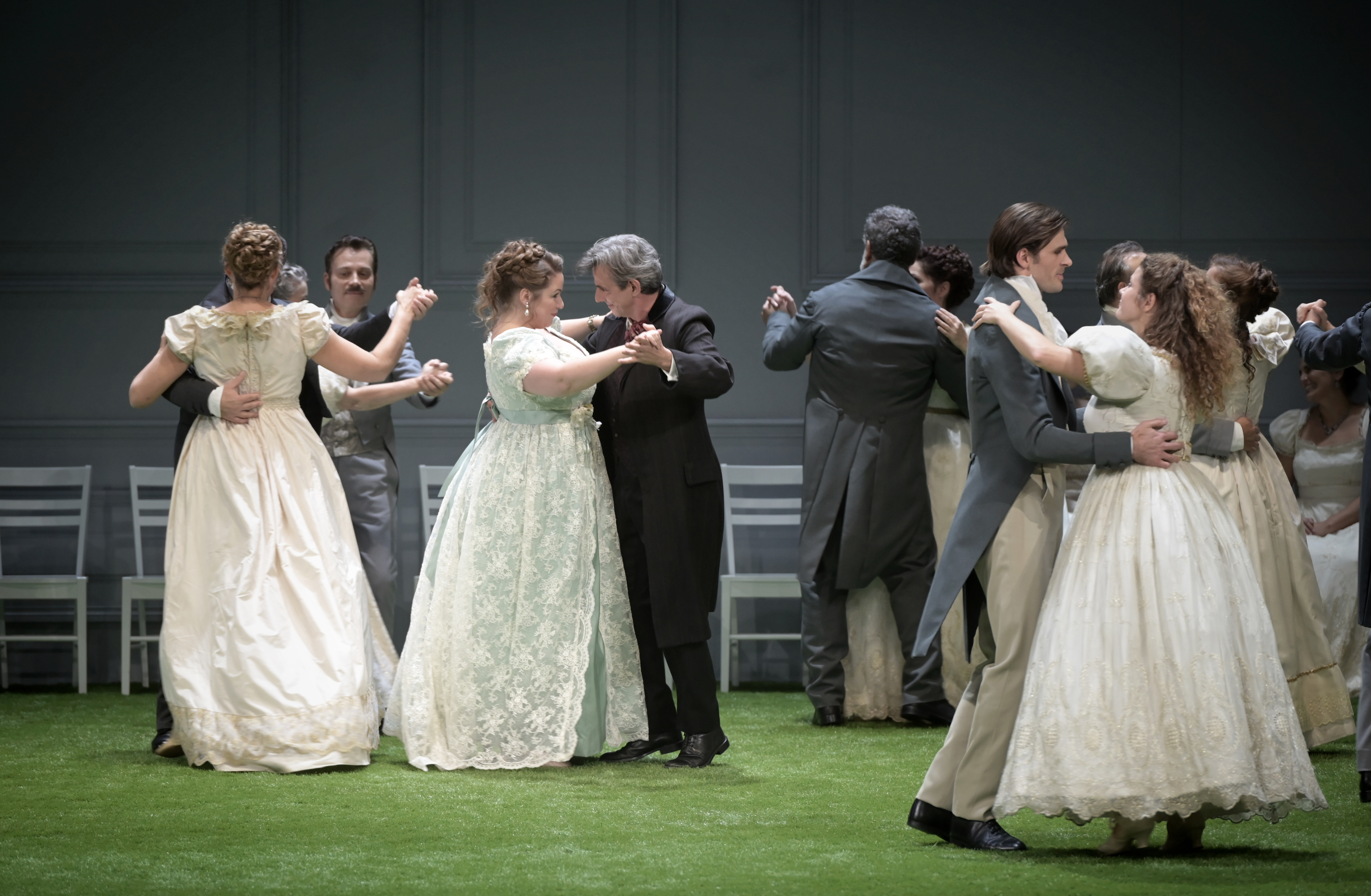 Ce sont des choix délibérés du metteur en scène Stéphane Braunschweig dont on ne peut que louer la recherche poussée sur cette œuvre, bénéficiant de sa connaissance approfondie des génies russes du théâtre du XIXème (il a mis en scène tout Tchekhov), qui apporte de nouveaux éclairages à cet opéra. Le décalage des costumes fait partie de sa réflexion entre le monde d’hier et de demain, la classe supérieure d’abord habillée dans l’esprit de son siècle dans les deux premiers Actes, puis dans un esprit début du siècle suivant dans l’Acte III, tranchant avec ceux des paysans, et d’une autre manière avec Onéguine affublé tout au long de l’opéra d’une même redingote, renforçant l’image de dégradation de ce personnage original devenant crépusculaire, sorte de mort vivant traversant chaque Acte, tout comme sa vie.