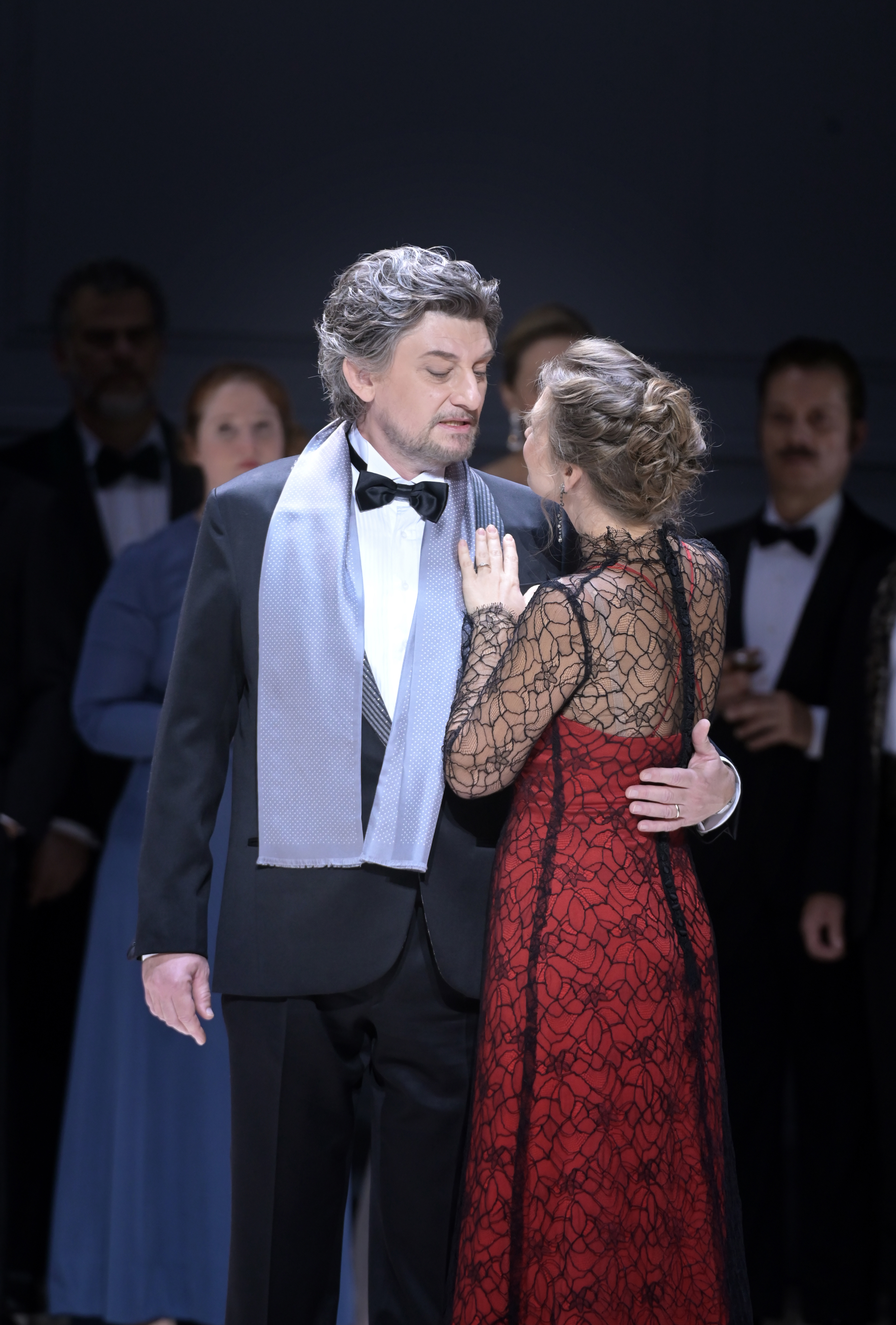 Gelena Gaskarova est dans cette production une Tatiana de substitution (en remplacement d’Avannina Santoni) de choix car elle a déjà joué ce rôle plusieurs fois, même si elle n’a pas la flamboyance d’Anna Netrebko qui a marqué le rôle ces dernières années, dans la production susmentionnée mise en scène par W. Decker. Si dans le premier Acte, la projection de la voix de la soprane russe n’est pas idéale et passe même difficilement la fosse parfois, il faut pour sa défense souligner qu’elle est mise en difficulté dès le premier air avec Olga par la mise en scène les plaçant de dos en milieu de plateau. Elle reste toutefois encore trop en retenue dans le (très) long air de la lettre à Onéguine, mais se rattrape dans le troisième Acte, aussi belle et majestueuse dans sa robe rouge recouverte de dentelle noire, qu’émouvante dans son duo avec Onéguine.