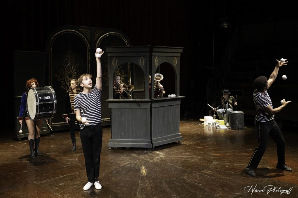 Qui n’a pas envie de retourner quelque fois en enfance sans honte et avec un plaisir manifeste ? Fanfare [expérience] électrique c’est du cirque sans tralala ni chichi, un peu foutraque mais d’une générosité sans pareille, une expérience qui décoiffe, embarquant les minots – et les parents ne sont pas en reste – une heure trente durant, lesquels sans barguigner font montre d’un enthousiasme sans triche, font des ho ! et des ha !, tapent des mains sans vergogne, des étoiles et des paillettes plein les mirettes. La fanfare tonitruante donne le la de cette création, un rythme d’enfer qui jamais ne faiblit, parfois quand même fait de la place au limonaire mélancolique, et sur la piste c’est une farandole, un précipité de talents se succédant, à la parade, présentée par une maîtresse de cérémonie, Petit Bouquet en madame Loyale pour mettre un peu d’ordre dans tout ça et de temps à autre passer le balais jusque dans les gradins. Jongleur en duo ou en solo, à pied ou en monocycle, diaboliste infernal, trapéziste, contorsionniste, équilibriste, c’est du classique mais revisité sans façon, avec force poésie et bonhomie. De l’énergie aussi, tout plein, à revendre. On ne s’étonne guère de voir un ours fil-de-fériste se métamorphoser en princesse de conte de fée, des violoncelles être en équilibre, une ballerine faire des pointes sur des goulots de bouteilles, des diabolos voler jusqu’aux cintres, des balles prendre leur envol toujours plus haut et se multiplier jusqu’au vertige, des voltigeurs en apesanteur prendre pour trapèze le lustre tout là-haut, ou s’enrouler entre terre et ciel et sans façon dans des pans de tissus, une contorsionniste se plier et se déplier tel un origami…  Sur la piste de bois du Cirque Electrique, point de sciure ici, entre cirque et music-hall c’est de la joie toute bête, toute simple, qui déborde de partout. Bataille de confettis et distribution de pop-corn, les parents ici ne sont pas en reste pour chiper à leur mômes ces quelques grains de maïs soufflé. Le grand ordonnateur de ce sympathique capharnaüm, capharnaüm en apparence seulement, en vigie sur la scène qui surplombe l’entrée de la piste, c’est Tapman (Hervé Vallée), homme-orchestre à la guitare, au violoncelle, au chant, et même aux gamelles de cuisine, partout à la fois, dirigeant cette fanfare électrique et, accessoirement, directeur de ce lieu singulier.  Et c’est ébouriffé, un peu sourd aussi, que l’on regagne la sortie, aussi bien par ce spectacle qui vous replonge en enfance, enfin pour qui a gardé son âme de môme, mais à voir les parents hurler au diapason de leur marmots rien ne semble perdu semble-t-il, que par ces gamins à l’enthousiasme contagieux et démonstratif.