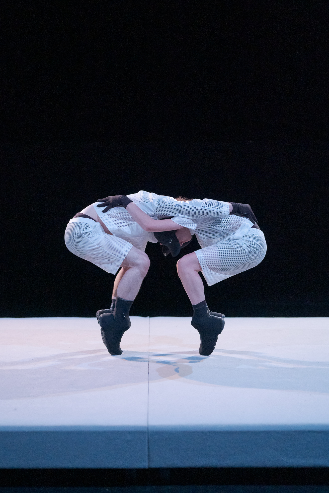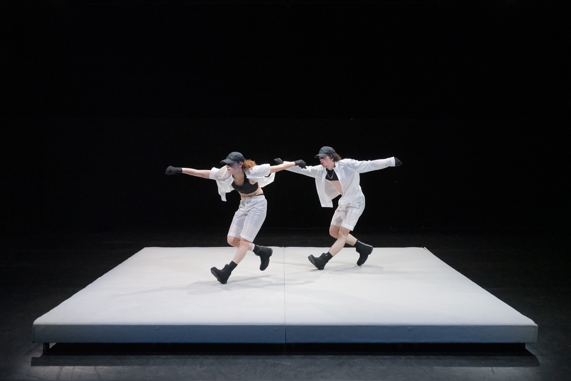 La proposition de Marco da Silva Ferreira, portée haut la main par Anka Postic et Chloé Robidoux, s’empare donc de la « Fantasie in F minor » de Franz Schubert. Elle n’est absolument pas la superposition d’une danse stigmatisée et réduite à certaines performances physiques et d’une musique « savante », elle est bien plutôt pure invention, pour reprendre un autre terme usité dans le champ de la composition musicale. L’inventivité est la source première de la fantaisie, elle est aussi la stratégie instinctive des transfuges de classe (si l’on veut poursuivre la lecture sociologique) pour pallier à la méconnaissance des codes régissant le milieu que l’on souhaite investir. Fantasie minor rayonne de cette intelligence, imposant son chemin de gestes, comme on trace sa route avec une belle et lumineuse assurance. La chorégraphie prend le parti pris d’une littéralité féconde : nos deux danseurs sont au bord d’un rectangle-estrade, ils viennent de la marge, ils en jouent, comme d’un coin où rebondir, prendre son élan. Leur possession de la scène se fera comme un saut dans le vide. Ils n’ont peur de rien, privilège de l’âge, atterrissant soudainement sur cette terre soulevée par les notes joueuses, presque frimeuses, toujours amies, de Frantz Schubert. Habillés tous deux de bermuda et de chemisette d’une blanche transparence, amples, leur tenue comme la danse qu’ils mènent est dégenrée, d’une folle liberté, laissant apparaître autant des silhouettes tyroliennes que la jeunesse la plus branchée, bras dessus bras dessous. La musique de Schubert est jouissance du rebond, comme une chevauchée sans fin : leur danse détourne alors le plié classique, qui se fait trot stylé. Marco da Silva Ferreira empruntera encore au vocabulaire classique dans le même registre décalé quelques pointes pataudes réalisées par de grosses chaussures noires. Le duo est probablement la forme la plus stéréotypée en danse : qu’à cela ne tienne, Marco da Silva Ferreira réussit le tour de force de le réinventer complètement, au plus près de la musique interprétée elle-même par quatre mains sans que jamais l’on ne s’interroge sur le genre de la main gauche et de la main droite.