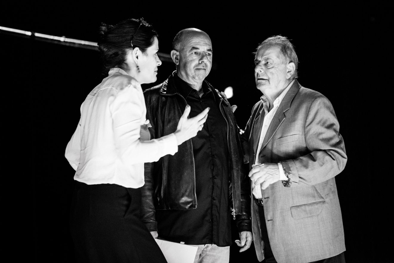 C’est en alternance Carole Thibaut ou Valérie Schwarcz qui incarnent la fille ; Mohamed Rouabhi joue Ric. Le rôle du père a été confié à Olivier Perrier, qui retourne pour cette occasion sur les planches. Il est peu de dire que cette apparition, que l’on n’espère pas crépusculaire, mais gage d’ouverture à d’autres lendemains, est symbolique et émouvante. Avec ses Fédérés, Olivier Perrier a porté l’aventure de la décentralisation, et la genèse du Théâtre des Îlets. Le voir revenir en père de Carole Thibaut, directrice du CDN, est un geste fort de transmission – celle d’un père qui a laissé sa « fille » seule jouer, à sa suite, sur les planches de son théâtre – et qu’on n’a pas besoin de tuer.