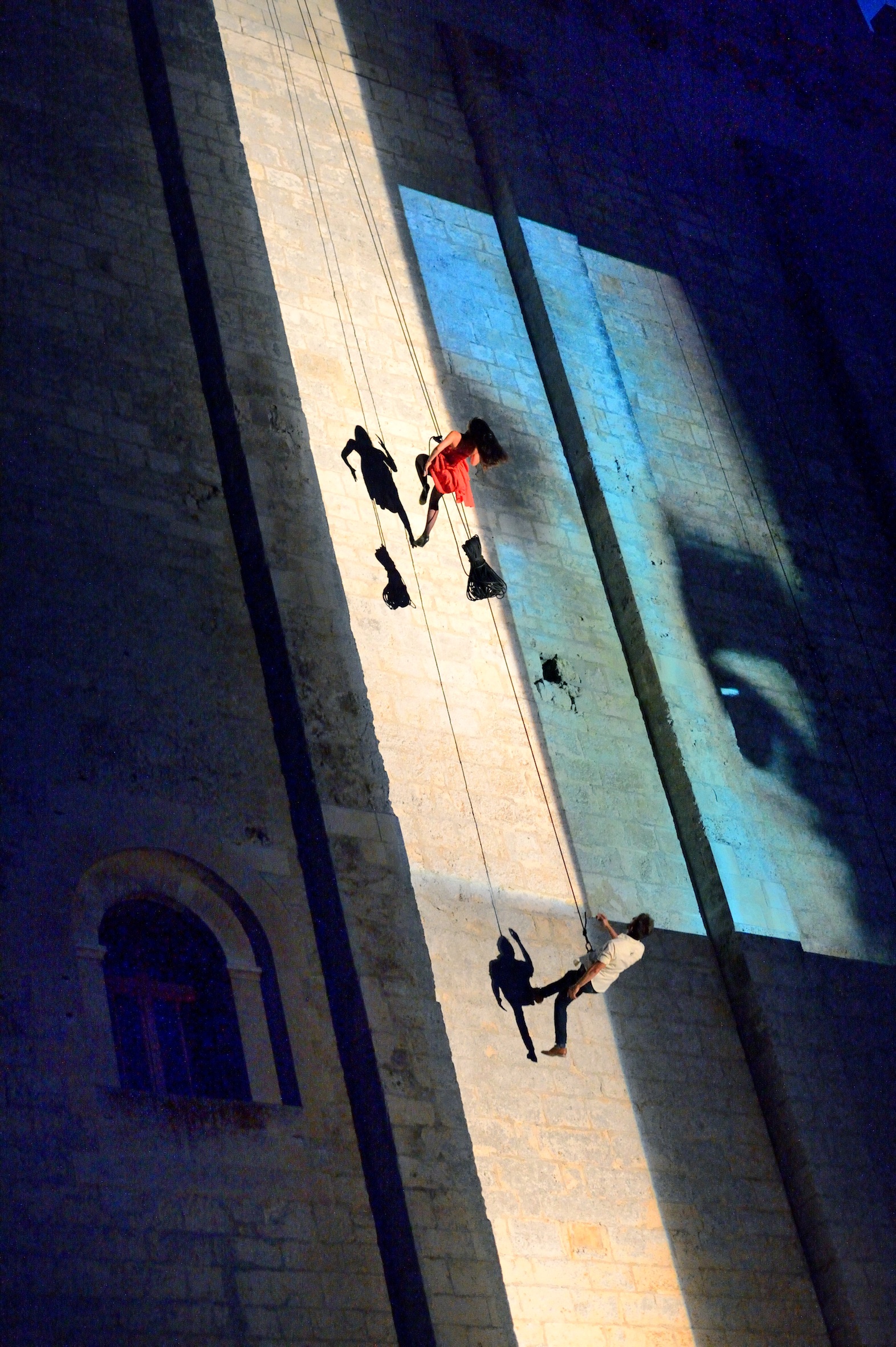 Après ce magnifique parcours sonore, le Palais Venaria Reale, nous ouvre ses portes et sa façade principale pour un spectacle sensuel sur le monde de la nuit. Guateque, réunit de la danse verticale, de la musique live et de la vidéo projetée sur l’immense bâtiment. Deux personnages, la nuit, lors d’une fête se rencontrent, se jaugent, s’évitent, se rapprochent…se cherchent et bien sûr se trouvent. Ils montent et descendent le long de la façade du Palais sur de la musique rock. Les vidéos concentrées sur leur visage nous font pénétrer dans leur intimité pendant que les corps dialoguent par mouvements et impulsions.