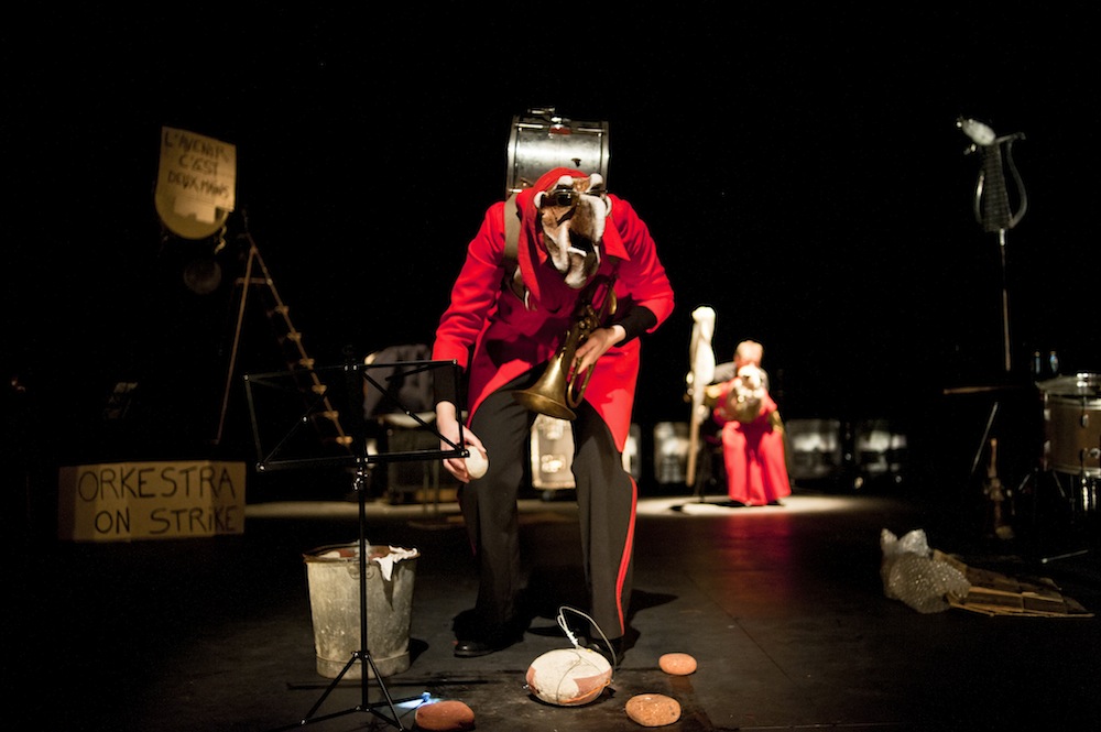 Toujours au Théâtre Astra, le Turak Théâtre met la politique capitaliste et commerciale à feu et à sang ! Un orchestre tente de survivre à la crise économique, une grève est organisée, la lutte pour la musique bat son plein…Mais l’ « esprit individualiste », distillé par une voix criarde, fait entrer un loup dans la bergerie ; un musicien prône un autre combat celui du « chacun pour soi ». Au chômage, les musiciens vont tout imaginer pour continuer à jouer de la musique… La poésie et la drôlerie qui se dégagent du spectacle, accentuent le dramatique de la situation. Les sujets sensibles comme la perte de l’emploi, l’isolement des individus, la voracité économique qui détruit les classes ouvrières… un tour complet et bien triste du monde capitaliste. La manière dont est traitée la place de l’artiste et de l’art au milieu de la politique du « profit coûte que coûte » fait grincer des dents. L’harmonie entre manipulateurs et marionnettes offrent une poésie rare ; les corps font tresse. La physionomie un peu lourde, un peu gauche des marionnettes est subtilement contrastée par leur inventivité ; ils imaginent de nouveaux instruments avec un bric à brac d’objets, tout en se battant contre un ennemi invisible et bien plus fort…