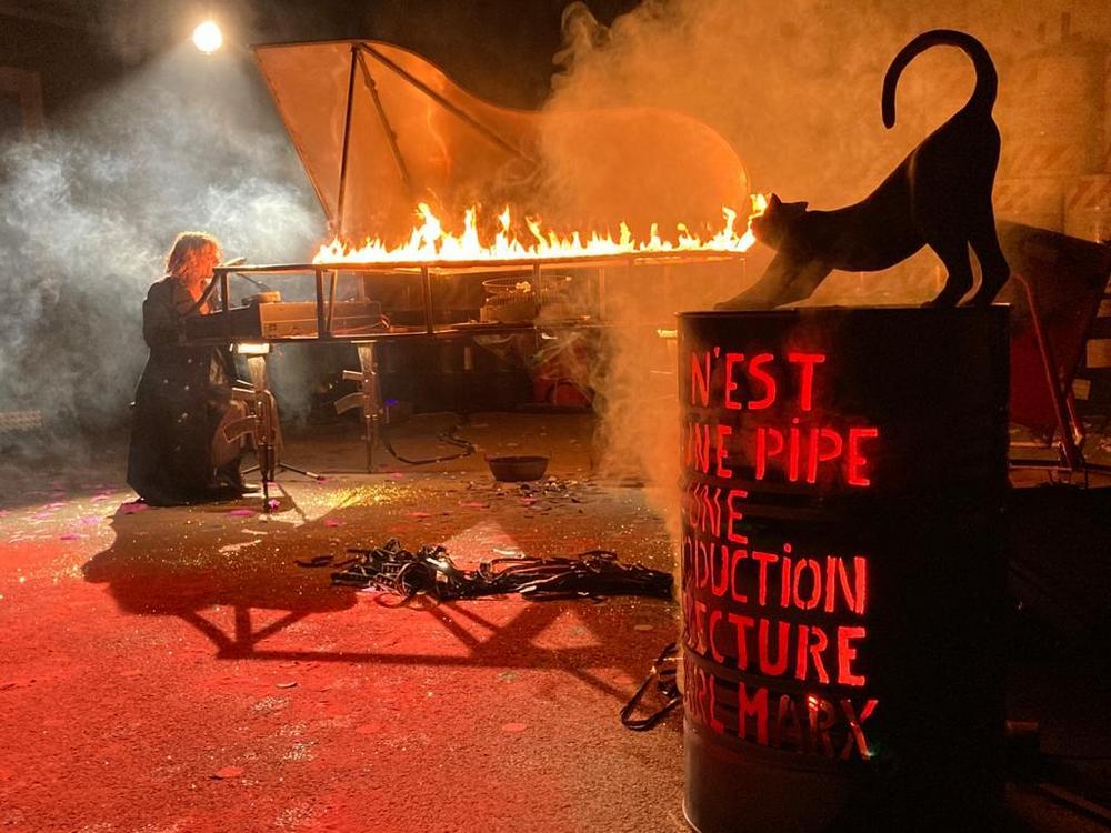 Un théâtre de rue qui se serait emparé de la scène des nantis. Comme une manif, comme un ardent rassemblement politique, comme une révolte en marche, poing levé, tête relevée, corps dressé, quittant les pavés étudiants, ouvriers, et qui se fomenterait dorénavant depuis les planches des arts vivants. FEU ! Ceci n’est pas une pipe ni une introduction à la lecture de Karl Marx fait œuvre dans ce déplacement, FEU ! nous met en marche au-delà de nos frontières esthétiques. Ce qui est ici proposé est un out qui deviendrait un inside : conçu initialement pour l’espace public, scénographié et accompagné artistiquement par Générik Vapeur, le projet de Nadège Prugnard s’installe entre les murs sans s’embourgeoiser. Le détournement est ailleurs, est un enrichissement : les fumigènes, les feux de bengales, se déterritorialisent et agrègent aux cortèges de nos soulèvements politiques les clairs-obscurs, les ombres et lumières, les apparitions et les brumes rougeoyantes du cabaret. Cet extérieur envahi par la chienlit, selon les mots repris par le pouvoir ad nauseam à chaque nouvelle époque, trouve refuge dans l’asile interlope d’une Marlène Dietrich, long manteau, mini short, ne mâchant pas ses mots, dépiécant à la hache de ses vers la carcasse immonde d’un capitalisme monstrueux. De même que la corde frappée d’un piano se réverbère contre le couvercle entrebâillé, FEU ! se nourrit de la réverbération des parcours politiques de Ulrike Meinof et de la bande à Baader, de leur radicalité violente stupéfiant leurs contemporains, inquiétant les forces de l’État, sur la pensée d’un présent sourd. Tout est écho pour qui sait tendre l’oreille. Dans la voix mitraillette de Nadège Prugnard qui est ce que les paillettes sont à la nuit : la cristallisation d’un cri dans le silence mortifère, dans ce flot inextinguible qui est un flow qui lui va comme un gant, débusquant les errements de notre temps, les mots trouent à l’instar des balles, avec cette assurance souveraine de pouvoir venir à bout de tout pouvoir, ou à l’inverse, avec ce brûlant désespoir où le poème nous consume de l’intérieur à petit feu. Empruntant à l’image populaire de la chanteuse de variété, accompagnée par une partition musicale de Renaud Grémillon osant le lyrisme, Nadège Prugnard échappe, par cette enveloppe à contremploi, à l’identification, brouille les pistes comme ces révolutionnaires, ces agitateurs politiques, travaillant sous couverture.