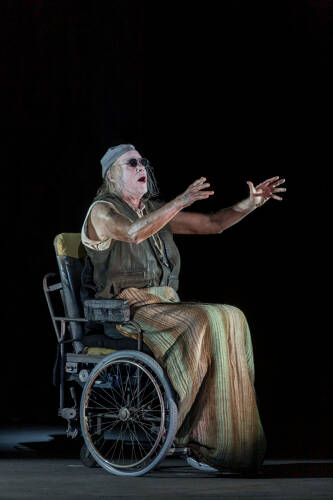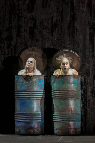Nell et Nagg incarnés par Hillary Summers et Leonardo Cortellazzi forment un duo délicieux. La contralto fait une première apparition dans le prologue ajouté par le compositeur tiré du poème Roundelay écrit vingt ans après Fin de partie par Beckett. Le sens de cet ajout ne relève pas de l’évidence. Le ténor est truculent. On ne sait comment du fin fond de sa poubelle, sa tête dépassant à peine, il projette aussi facilement sa voix de bel canto. Par ailleurs sa présence est fabuleuse, usant avec efficacité de tout ce qu’il peut, le roulement de ses yeux, les soubresauts des doigts de ses mains jamais en repos, les inclinations de la tête.