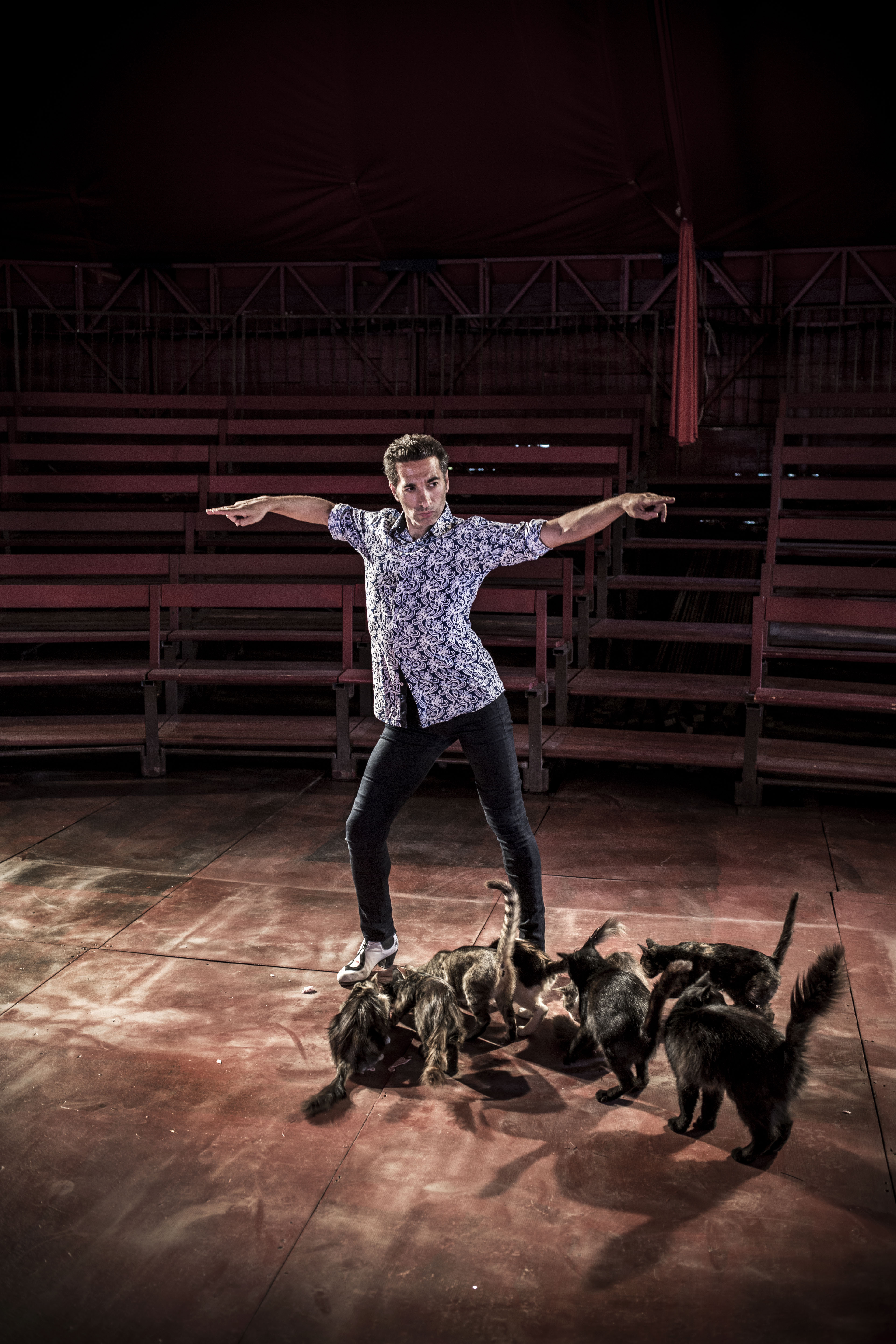 Sous le petit chapiteau du cirque Romanès, Israel Gavanna a pris ses quartiers. Création chaleureuse ou la proximité du danseur avec le public et la faconde d’Alexandre Romanès invitent au partage. Étrange et beau spectacle, tout simple et épuré, élégant et brut, où règnent les chats en maître des lieux. Israel Gavana fait flamenco de tout bois. Quelques solos comme autant d’esquisses ou d’essais sans façon où se déploie toute la maîtrise de son art. Bras déliés qui dessinent une géométrie abstraite et découpent l’espace, mains et doigts qui happent l’air et claquent, buste ferme et droit, mobile, pieds ancrés au sol tambouriné fermement, frappé de façon magistrale. Tempo hallucinant, glissando qui va de crescendo en decrescendo imprévisibles avant de mourir dans un soupir ou brisé net. C’est précis et tranchant. Qu’il danse en ouverture chaussé de soques japonaise ou plus loin d’une paire de chaussures rouges à talon haut, sur une estrade de bois, une poutre étroite de métal, une plaque d’acier, les cordes d’un cadre de piano, voire un rocking-chair de métal, tout est matière à explorer, pousser les limites et les retranchements de sa danse nerveuse et racée, d’une liberté franche et audacieuse mais aux racines profondes. Audace et maîtrise. Israel Galván improvise et s’amuse. Mais ici, sous le ciel de ce chapiteau à la couleur passée, au cœur battant grand comme ça, Israel Galván a choisi le partage, la rencontre. Qu’il dialogue avec la guitare de Caracafé, moment de grâce suspendue, ou accompagne avec délicatesse, de la pointe de ses souliers ferrés, le chant bouleversant tsigane de Délia Romanès, ce sont des instants privilégiés. L’émotion est palpable. Alexandre Romanès reste en retrait, admiratif c’est évident. A peine intervient-il. Il laisse faire avec bonheur c’est certain. L’important c’est ce temps de fête et de générosité. Et les chats ? Maîtres des lieux donc, ils sont une petite dizaine qui vont et viennent, indifférents. Plus que les quatre espérés par Israel Galván. A peine consentent-ils, du bout de leur moustaches, à répondre aux sollicitations d’Alexandre Romanès. La bataille des chats, qui donne son titre à cette création, n’est pas pour aujourd’hui.