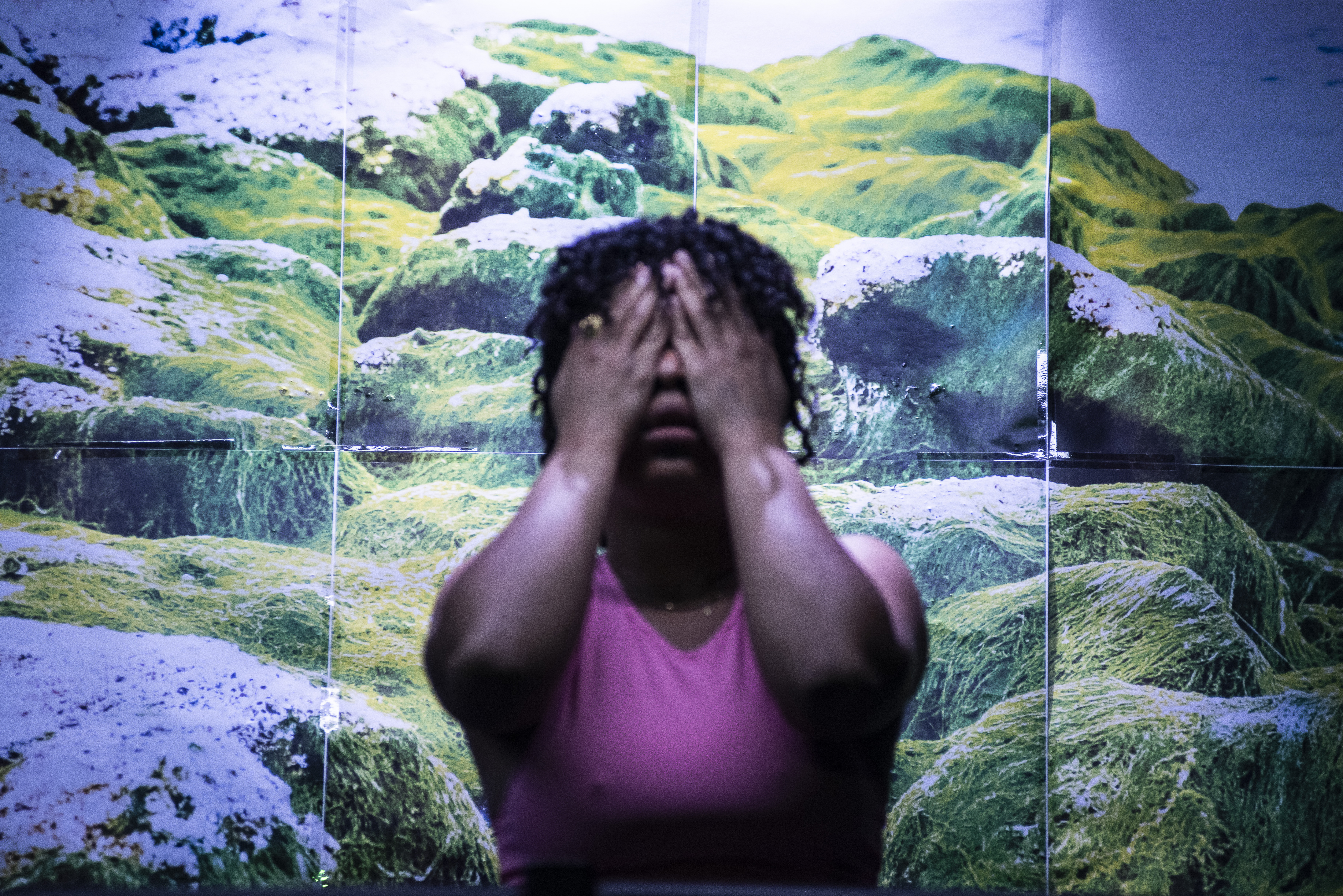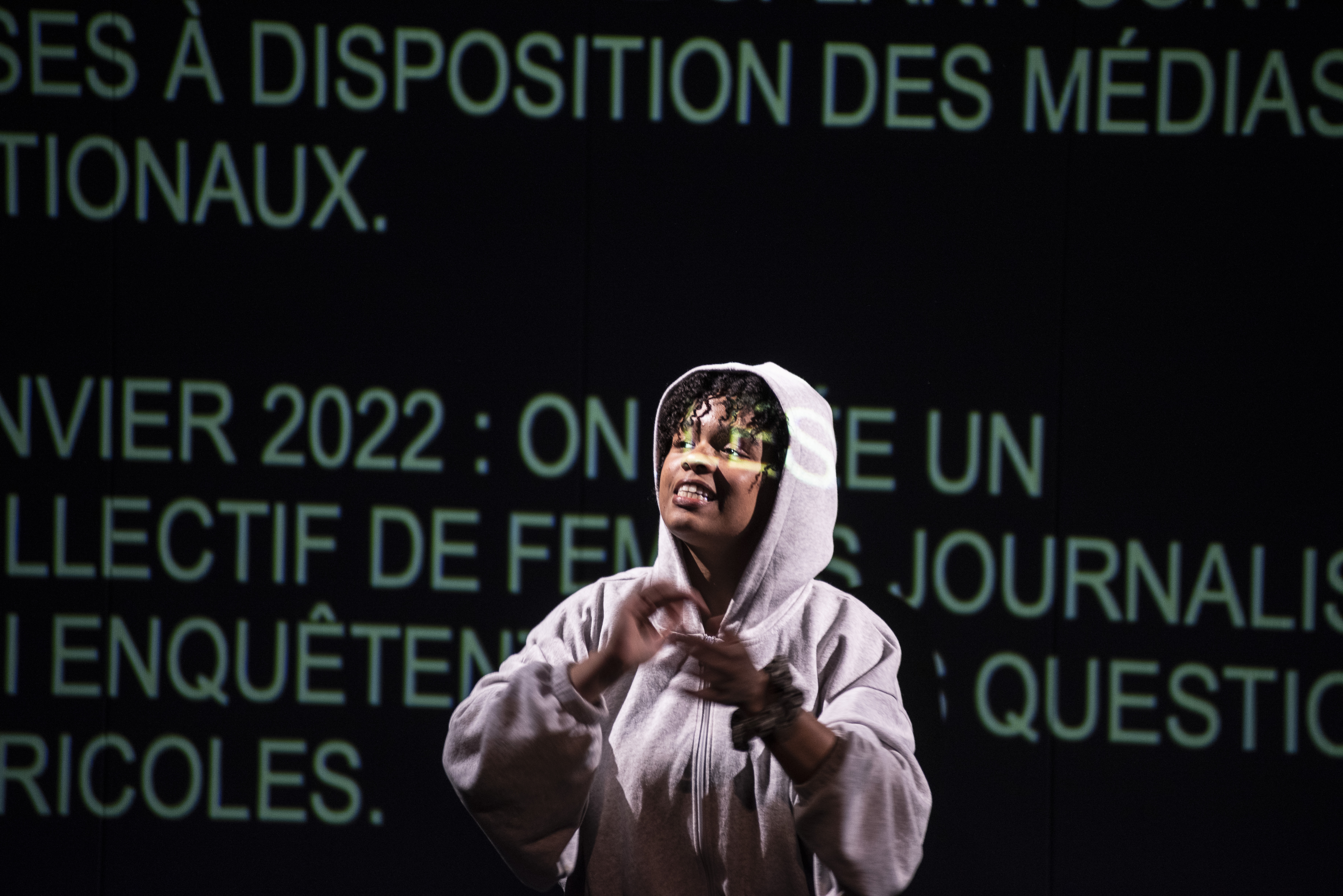 La performance est déambulatoire et on ne s’installe pas tellement. Elle est pensée pour que l’on soit plongé d’abord dans l’un des deux sujets, puis dans l’autre. Les algues vertes en Bretagne d’une part, et l’exploitation de travailleurs étrangers dans le Sud de la France ensuite. Par des chiffres détaillés, de la vidéo et de l’audio extraits des recherches des journalistes, on expose, on rappe, on s’essouffle, on perd son calme, on tâche d’informer. Puis on trouve un point de convergence, on se rejoint et on se raconte.