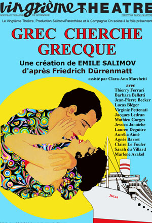 Tiré d’une nouvelle de Friedrich Dürrenmatt, Grec cherche Grecque est un spectacle fait de pantomime, de danse et de travail choral. Et les propositions servent le personnage plutôt réussi d’Arnolphe, entre passivité tendre et principes moraux d’enfant. Mais ce genre de proposition totale, avec beaucoup de décors, de costumes, et de formes de narration demande de la précision, et de la finesse, qui manquent ici. On ne trouve pas l’unité technique nécessaire aux scènes chorégraphiées et aux personnages colorés, pleins de folie, carnavalesques.