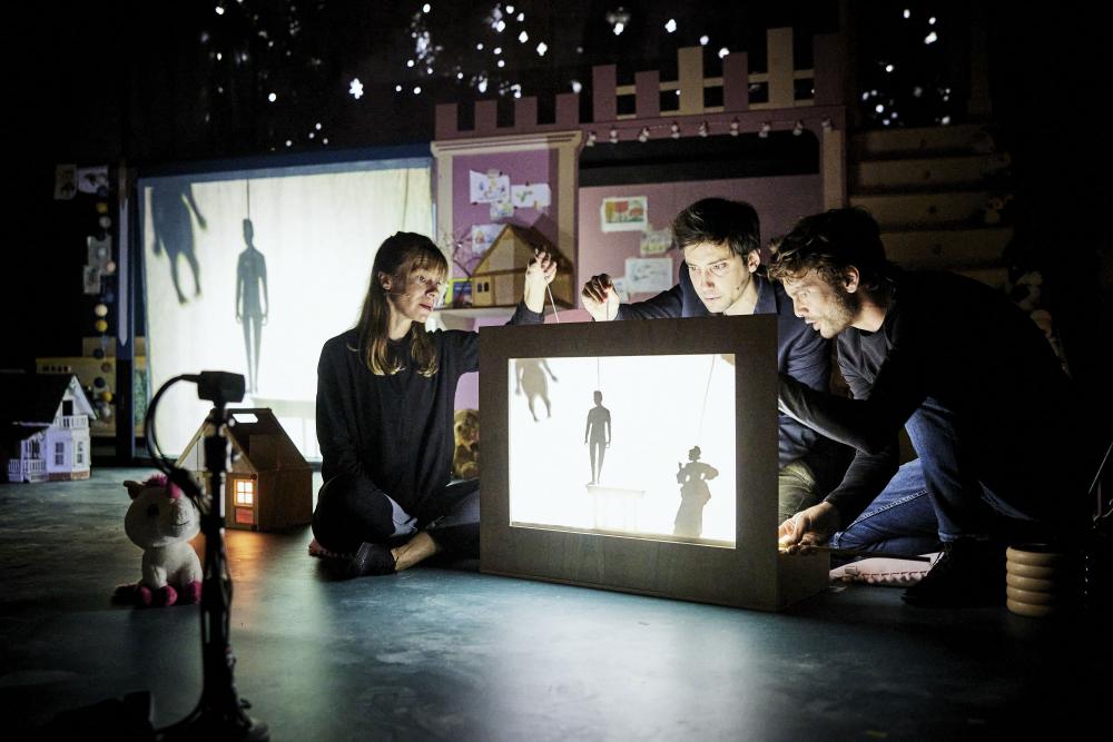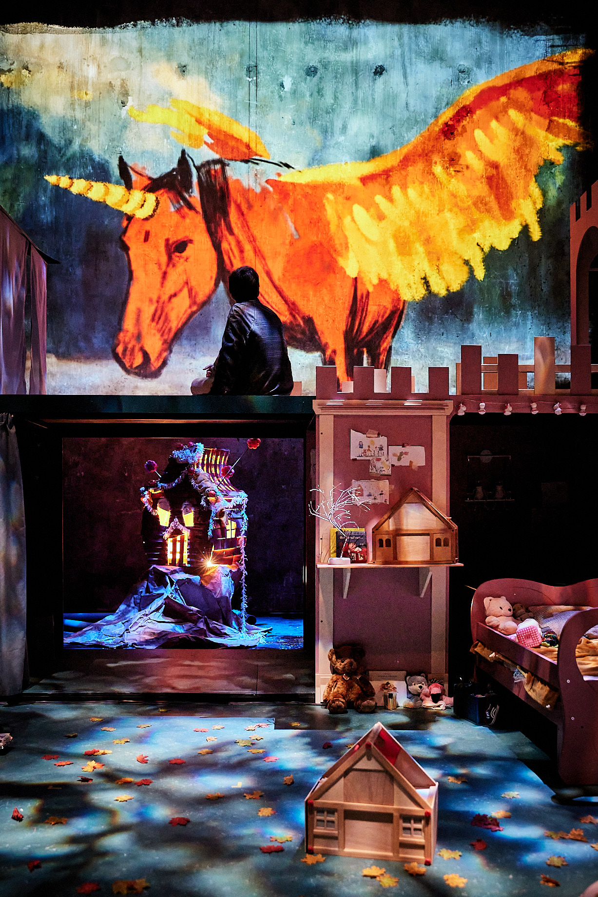 Dans un décor hyperréaliste de chambre d’enfants avec train électrique, peluches et poupées, le conte devient réalité augmentée. Les trois comédiens, Esther Van Driesch, Sylvain Debry et Igor Mendjisky en personne accomplissent une performance. Ils jouent vingt-cinq personnages, changent de voix en un instant et nous attirent vers un monde de sensations et d’émotions. On sent le gâteau qui cuit sur le fourneau de la sorcière, le bruissement d’une licorne magique.