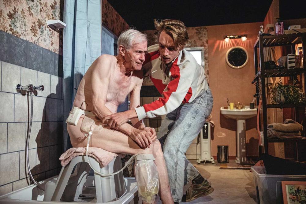 Les comédiens sur le plateau ont beau faire avec talent (excellent Arne de Tremerie notamment), leurs bouts d’histoires personnelles, enfances plus ou moins heureuses, expérience à l’armée, pratique théâtrale, annonce de la mort d’un enfant sur un groupe whatsapp, deuil de son propre enfant, traversée d’un cancer, dépendance liée à la fin de vie (avec la douche du vieil homme nu et le placement de la couche sur le lit, dans une esthétique moins dramatisée que dans la scène marquante de Sur le visage du concept du fils de Dieu de Castellucci) ne font ni un tout, ni sens. Même si on se laisse porter un temps par ces gestes du quotidien dans cet appartement années 60 où l’on n’a pas l’impression de regarder par le trou de la serrure car les comédiens s’adressent à nous frontalement tour à tour, ou s’imposent sur le grand écran, on finit par ressentir que ce qui se passe sur le plateau n’est qu’un habillage, un prétexte, pour cette projection de suicide assisté, où après le sourire rayonnant de Johanna B., c’est sa bouche ouverte et torve qui s’impose comme mémoire finale pendant de longues minutes. Ce théâtre dit du réel est-il encore du théâtre ? On peut tout à fait admettre qu’il y a une place pour une dramaturgie de l’euthanasie. Mais quel est ici l’objet de ce geste dramaturgique ? Même si Milo Rau rappelle toujours qu’il fut élève de Bourdieu (et qu’il a enseigné la sociologie, v. notamment sans son ouvrage Vers un réalisme global paru à L’Arche en 2021), qui prônait la participation comme approche méthodologique, il ne peut évidemment y avoir de participation active ici ; est-ce que ce parti pris presque hérétique de refus de la distanciation, est la meilleure manière d’aborder le débat (ô combien indispensable) sur la fin de vie ?