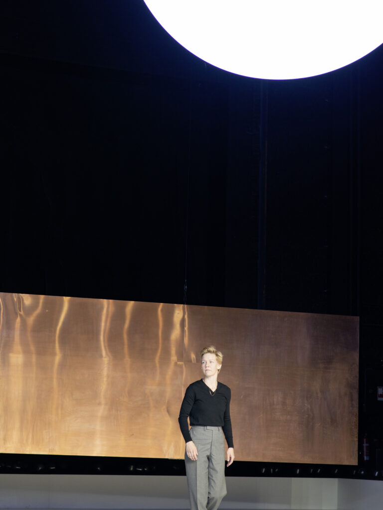 La réussite tient largement à l’attribution du rôle-titre à la comédienne Sandra Hüller que le public français connaît mieux depuis Anatomie d’une chute de Justine Triet. Et c’est comme une évidence. Pas un instant, on se demande pourquoi le metteur en scène néerlandais a choisi une femme pour ce rôle. En tout état de cause, ce n’est pas novateur, puisqu’entre autres la grande Sarah (Bernhardt) s’y était confrontée. Mais surtout, parce que l’on conçoit mieux que jamais que cela n’a strictement aucune importance. Ce qui est derrière ce personnage dépasse le sexe ou le genre. Il n’est question que d’être. L’existence d’un être humain parmi ses frères humains, qui s’éloignent pourtant tant de leur nature humaine. Si l’on ne voulait pas faire de sexisme inversé ou être accusée d’une forme de misandrie, on dirait même qu’une femme est bien mieux à même de s’emparer de la sensibilité de ce personnage, de ses errances et ses impérities dans un monde qu’il ne peut comprendre. Le fou n’est pas Hamlet, mais le monde qui l’entoure. Hamlet n’est au contraire que lucidité. La clairvoyance ne rend pas fou, ainsi que le dicton aime à le dire, mais désorienté, inapte à trouver une place. Ce n’est pas à un crane que Sandra Hüller s’adresse dans la célèbre réplique (To be or not to be), mais à son oncle devenu beau-père, c’est lui qui est l’élément révélateur de la crise existentielle. Le Hamletde Simons/Hüller est manipulé, pris en sandwich (ainsi que le montre bien la mise en scène dans un passage corporellement illustratif) entre sa mère et son beau-père, mais également entre ces derniers et la voix de son père réclamant vengeance, laquelle n’est peut-être que celle de son inconscient exprimant son désir propre.