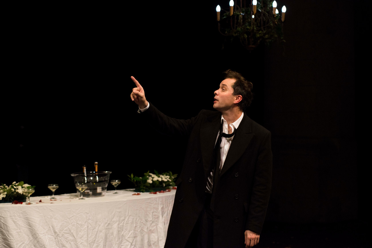 Après un Misanthrope de haute volée et d’une grande énergie avec un propos et une mise en scène d’une rare intelligence et qui avait bluffé, nous attendions beaucoup de cet Hamlet. (Nous n’avons pas vu, hélas, La Mouette, second opus d’une trilogie qu’Hamlet veut clore). Trop peut-être. Avec Shakespeare, Thibault Perrenoud trébuche. Pas de haut quand même et il n’y a pas grand mal ni mort d’homme. La mise en scène a de certaines qualités et quelques pépites sont à retenir. Seulement voilà, la traduction de Clément Camar-Mercier est des plus triviale, sans souffle véritable, et le texte de Shakespeare s’en trouve comme tout plat, terre à terre et dépouillé de toute poésie, de tout envol, une traduction toute entière soumise et contrainte par la mise en scène de Thibault Perrenoud, de sa vision propre. Cette dernière étant, las, quelque peu limitée ici, rien ne décolle vraiment. On cherche en vain, dans le formidable maelstrom et la complexité de cette œuvre tant visitée, un propos, un point de vue, un angle d’attaque. Rien n’apparaît vraiment sinon une lecture linéaire et sans heurt, sans aspérité de l’œuvre. Thibault Perrenoud suit la dramaturgie fidèlement, à la lettre, et n’en retire rien, n’exhausse rien, n’invente pas grand-chose à vrai dire. Certes on pourrait disserter sur le fait que les acteurs ont double charge, le fantôme du père est aussi l’oncle régicide, Laërte est également Polonius et Gertrude, Ophélie. Un jeu psychanalytique qui voudrait interroger les rapports symboliques de filiation… Tuer le père, épouser sa mère, Hamlet est un drame œdipien… Soit, mais probant ou non, déjà vu et rebattu. Thibaud Perrenoud, Hamlet, joue lui de la folie, vraie ou simulée, et trouve là un terrain de jeu propice et attendu pour un acteur. Et c’est un excellent comédien, sa prestation est impeccable. Mais fallait-il tirer tout ça vers le grotesque obérant de facto la crédibilité de son comportement ? Tout ne l’est pas dans l’ensemble mais c’est ce qu’on retient en premier lieu tant celui-ci barbouille et gâche les moments d’émotions, car il y en a, et de fragilité chez son personnage et même de l’ensemble de la mise en scène. Prenons la scène où Hamlet par le truchement du théâtre dévoile et dénonce le meurtre de son père. Pourquoi le tirer dans une telle mascarade, un jeu outrancier ? Et la folie d’Ophélie, grommelée et inaudible… alors même qu’Aurore Paris, dans le double rôle Gertrude/Ophélie est remarquable et offre à ses deux personnages de belles couleurs, un très beau nuancier et sans afféterie aucune. Sans compter la fin, le duel mortel, totalement ratée. Des intentions il y en a dans cette mise en scène mais elles ne restent que des intentions, des idées suspendues au personnage et aux basques des frasques d’Hamlet qu’on aurait souhaité pour l’heur d’être davantage plus complexe que figé, cramponné dans cette folie simulée et donc de fait extravertie (voyez comme je joue à jouer la folie) qui annule et ne semble pas vouloir autoriser tout autre émotion. Et surtout finit par lasser quand ce surjeu gagne les autres personnages et ne se justifie que difficilement. On ne voit pas vraiment au final où Thibault Perrenoud, le metteur en scène, va, ni quel chemin il semble emprunter, ni au fond ce qu’il souhaite exprimer. Où est le sens de tout ça et en premier lieu celui du texte ? Sans demander une relecture contemporaine, on espérait au moins un questionnement plus qu’une illustration de l’œuvre. Reste certes le plaisir affirmé du jeu. De fait Thibault Perrenoud embarque avec lui les spectateurs, qu’il interpelle souvent et par une scénographie qui les inclut (scène tri-frontale et dans cette salle de banquet désertée certains font office d’invités.) Théâtre dans le théâtre, mise en abyme et jeu de miroir, appréhension de la pièce comme une œuvre collective, une performance, un work in progress… Tout cela à la fois sans doute. Cela a ses qualités mais aussi ses défauts. Mais peut-être est-ce là, tout bêtement, que se situe le cœur de cette mise en scène. Rien que le jeu, tout pour le jeu. Alors oui, de ce point de vue, malgré nos réserves, c’est sans doute réussi. Mais frustrant.