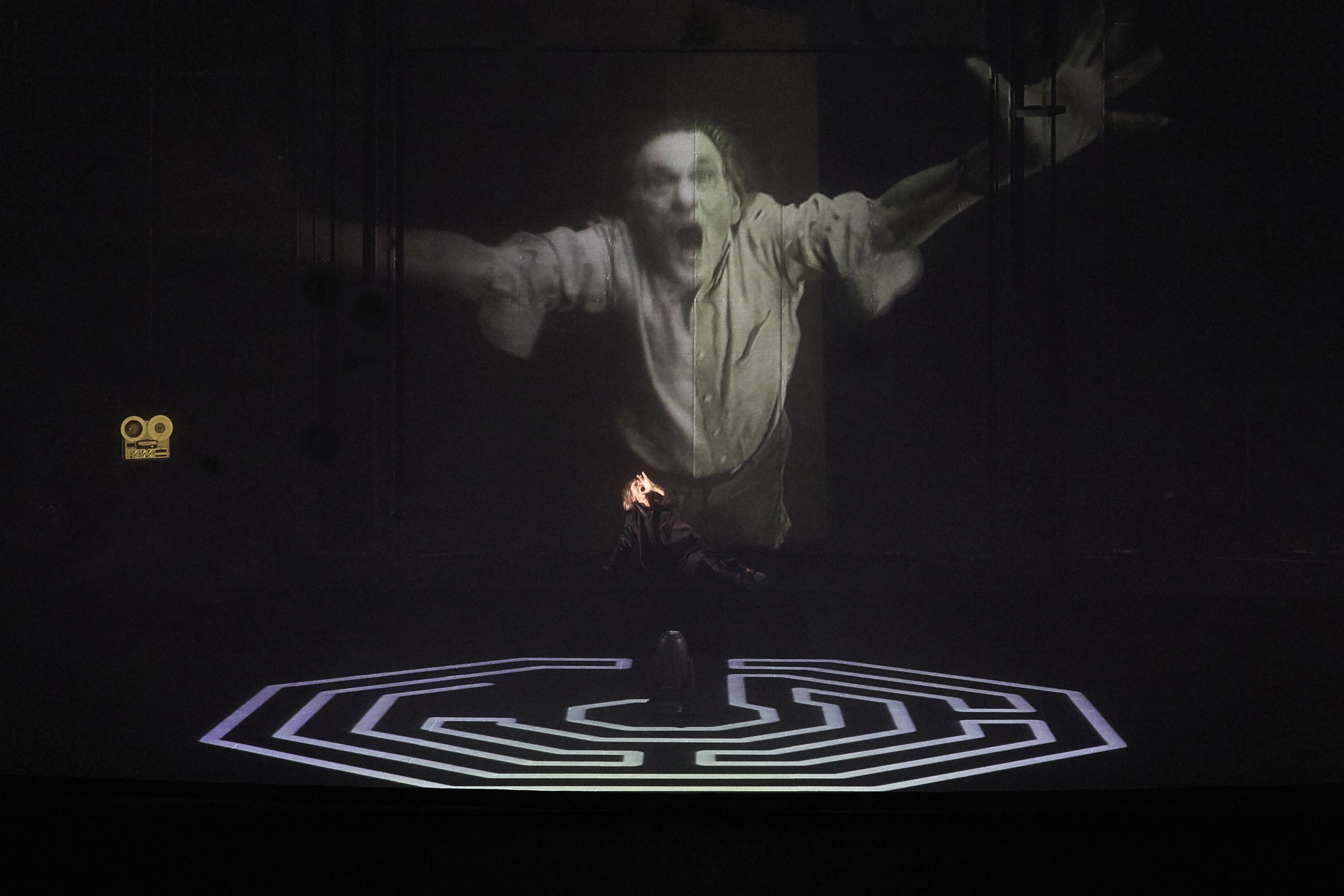 Serge Merlin fait un magistral et original pas de côté. Répondant au projet de Wilfried Wendling, une adaptation sonore, opératique, et visuelle d’Hamlet, sur musique originale de Pierre Henry, le tout réalisé par la Muse en Circuit*. Serge Merlin, acteur intransigeant et fantasque, nous entraîne dans un trip véritablement halluciné. Ici nous sommes hors de tout, hors du temps, dans un espace indéfini, espace mental sûrement, dans le crâne de Serge Merlin sans doute. Immergé dans un espace sonore et visuel cauchemardesque, où domine l’obscurité, qui vous engloutit, vous noie, vous étouffe, sans repère autre que ce vieil acteur vacillant, errant en aveugle, qui lui-même ne cesse de se dissoudre, disparaître, tel un hologramme, et ressurgir de nulle part, démultiplié par les images qui envahissent tout l’espace du théâtre devenu l’horizon mental d’un spectre vivant. D’Hamlet il ne reste que quelques bribes, quelques scènes emblématiques chaotiques et monologues en lambeaux joués et rabâchés magnifiquement, ô combien, par Serge Merlin de sa voix unique, sépulcrale et qui semble hanter l’acteur jusqu’à la folie, le mener au bord d’un gouffre. Cette voix parfois dissociée de l’acteur, désincarnée, lui dématérialisé soudain et dont il ne reste plus traces autre que cette voix sortie du néant, de l’oubli, ultime héritage, articulée de façon si singulière et reconnaissable. Un comédien hagard, fantomal, portant en lui la mémoire du théâtre, l’imaginaire théâtral et intergénérationnel autour d’un personnage shakespearien emblématique dont il serait le dernier avatar. Ils sont presque tous là, fugaces apparitions, ceux qui l’interprétèrent, vivants ou morts – c’est du pareil au même – archives mémorielles écrasantes, figures tutélaires, versions multiples et démultipliés et que Serge Merlin rejoint à son tour. Ce vieil homme, ce vieil Hamlet, ce vieil acteur n’est plus de ce monde, il est hors du temps, hors de tout lieu, de toute réalité, désormais dans cet espace propre au théâtre, l’espace de la mémoire au risque de l’oubli. C’est toute la force de cette création de nous y plonger, de nous y faire chuter à notre tour, abolir tous repères. Mémoire interrogée désespérément tel Krapp dans La dernière bande de Samuel Beckett et dont ici il est fait, malicieux clin d’œil pour qui l’interpréta de façon marquante, référence. L’acteur et le personnage ne font plus qu’un, il n’y a plus d’incarnation mais possession. Ce n’est plus l’acteur qui possède le rôle, mais le personnage l’acteur. Hamlet est le spectre qui hante Serge Merlin. Ou Serge Merlin hante-t-il le spectre d’Hamlet ? Dans cet espace affranchi de toutes perspectives et repères la raison bascule et bouscule la mémoire. La musique de Pierre Henry, composée pour cette occasion, est un opéra sauvage et oppressant pour une voix parlée, sombre et éclatant cénotaphe pour un personnage, Hamlet, et tombeau théâtral pour un acteur hors norme. Elle n’illustre pas, elle signe la folie d’un homme, elle en est aussi l’expression sensible. Elle est toutes les voix et le chaos infernal qui entraîne ce comédien perdu dans son rêve shakespearien vers l’abîme. Milosh Luczynski signe une scénographie plastique et visuelle hallucinante en totale adéquation avec la partition et la mise en scène. Entre télésurveillance paranoïaque totalitaire et onirisme démentiel, délires hallucinatoires et rêves abruptes. Totalement immersif, au même titre que le son, et qui enclot à son tour sans échappatoire le spectateur et l’entraîne dans cette folie. La réussite de cette mise en scène et proposition de Wilfried Wendling tient sans nul doute à cet équilibre, cette osmose parfaite entre ces différentes interventions qui en font véritablement une œuvre cohérente, tant sur le fond que la forme, ici indissociés. Serge Merlin, qui n’avait jusque-là jamais joué le rôle d’Hamlet, réussit la gageure de l’interpréter avec une démesure et une liberté que lui permet son âge, affranchi de toute réserve, mais avec le poids de tous les personnages qui jusqu’ici l’ont traversé. Plus qu’Hamlet, ou bien au-delà, c’est peut-être ça qui se joue ici, mis en scène, le poids dense d’une vie au service exigeant d’un art qui ne vous lâche pas, au risque de sombrer, et la transmission de la mémoire vive et fragile du théâtre.