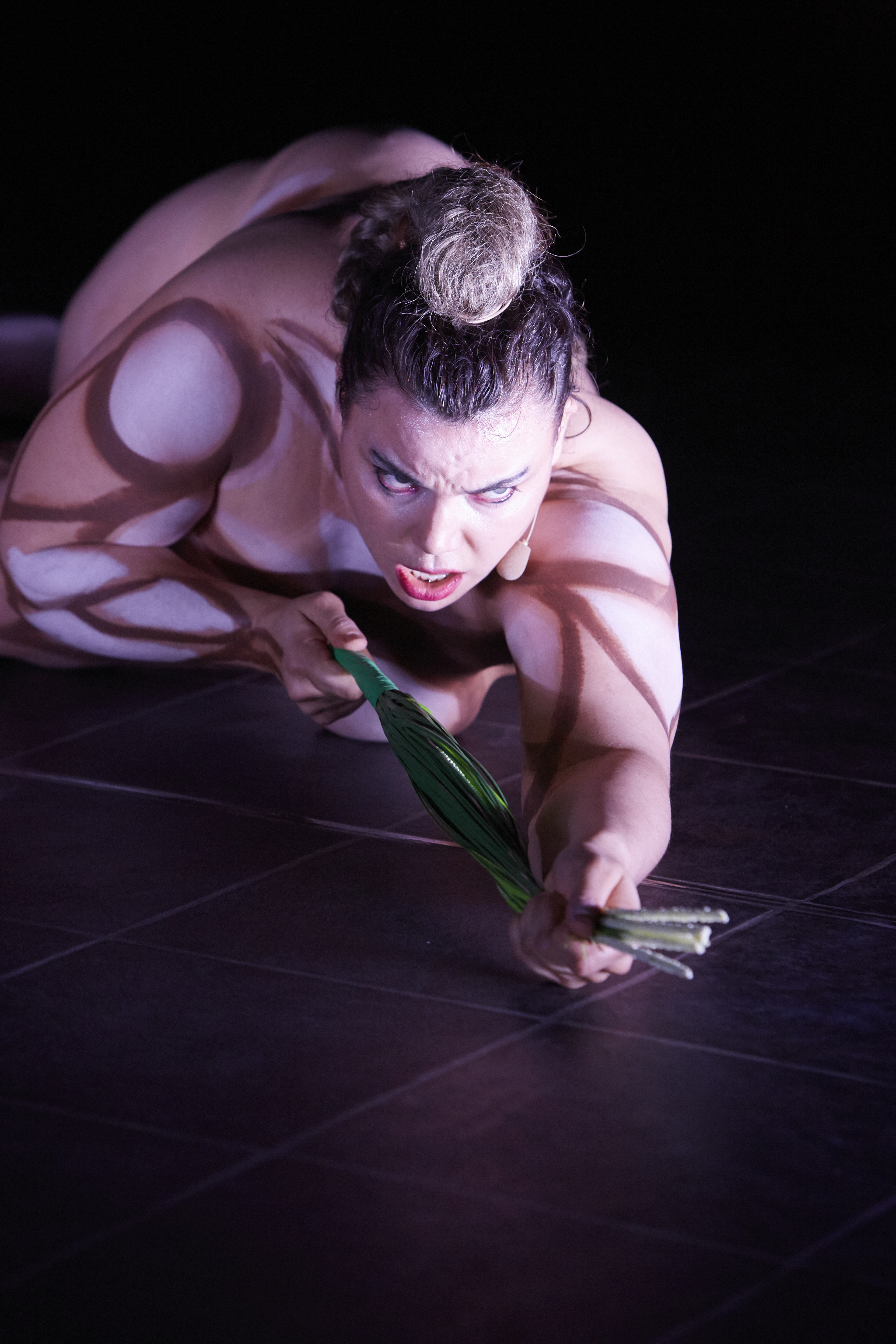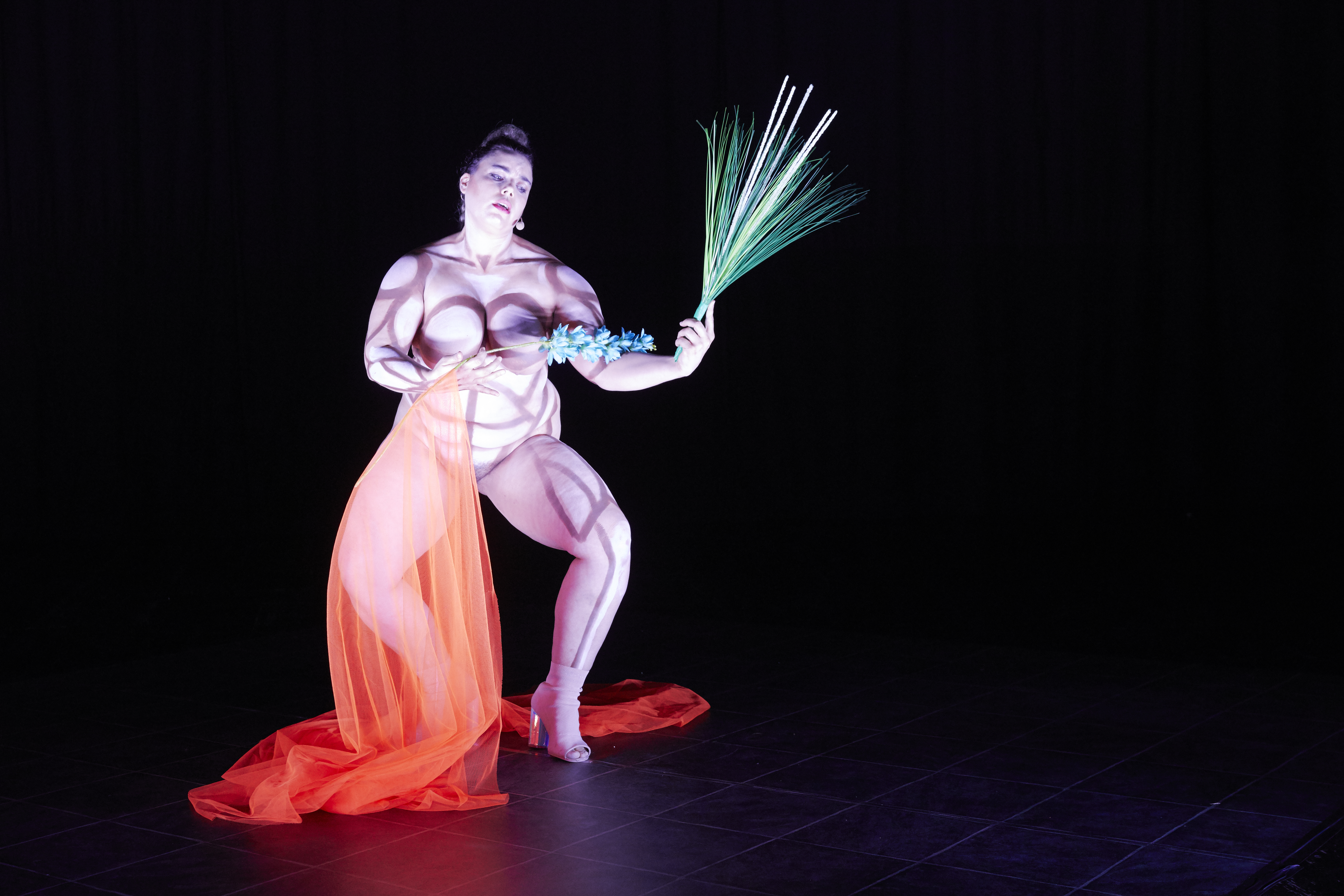 Elle dort, au centre du petit plateau. Corps nu, peint comme un vitrail, à peine couvert d’un voile rouge, le rouge de la passion. S’éveille enfin doucement et chante un cantique, ode à Marie, vierge pure. Prend des poses de mater dolorosa, iconographie usuelle dont elle se joue, les yeux au ciel, avec malice. Se flagelle avec la palme du martyr sur du disco, I feel love et Donna Summer. Pas de hasard dans ce choix équivoque. Voilà pour l’icône. Enfin se débarrasse de son voile qu’elle cale jusqu’à la douleur dans son vagin. Et de pénétration elle en parle, geste dessiné à l’appui, un doigt, puis un poing, pour dire la violence phallocrate qui impose la domination par le phallus pénétrant et l’hymen déchiré. C’est net, terrible et précis. Avant de disserter sur l’hymen, son importance dans l’assujettissement des femmes, enjeu d’un contrat social déterminé par le patriarcat. Teresa Vittucci balaye tout ça et prône l’émancipation, la réappropriation de son corps, de son vagin et de son hymen. De sa sexualité, de son plaisir. Fini le patriarcat, place au matriarcat dont la vierge Marie serait la matriarche, ni vierge ni martyre mais femme puissante et libre, nouvelle icône féministe et queer, libérée d’une construction machiste. Dans la lignée d’Annie Sprinkle, moins trash, résolument provocatrice mais avec autant d’humour et de liberté, Teresa Vittucci impose superbement son corps dont elle fait un enjeu politique dans sa recherche chorégraphique-performative sur la haine et le féminisme. Hate me, tendersolo pour un futur féminisme » en est le sous-titre) a reçu le prix suisse de la danse 2019.